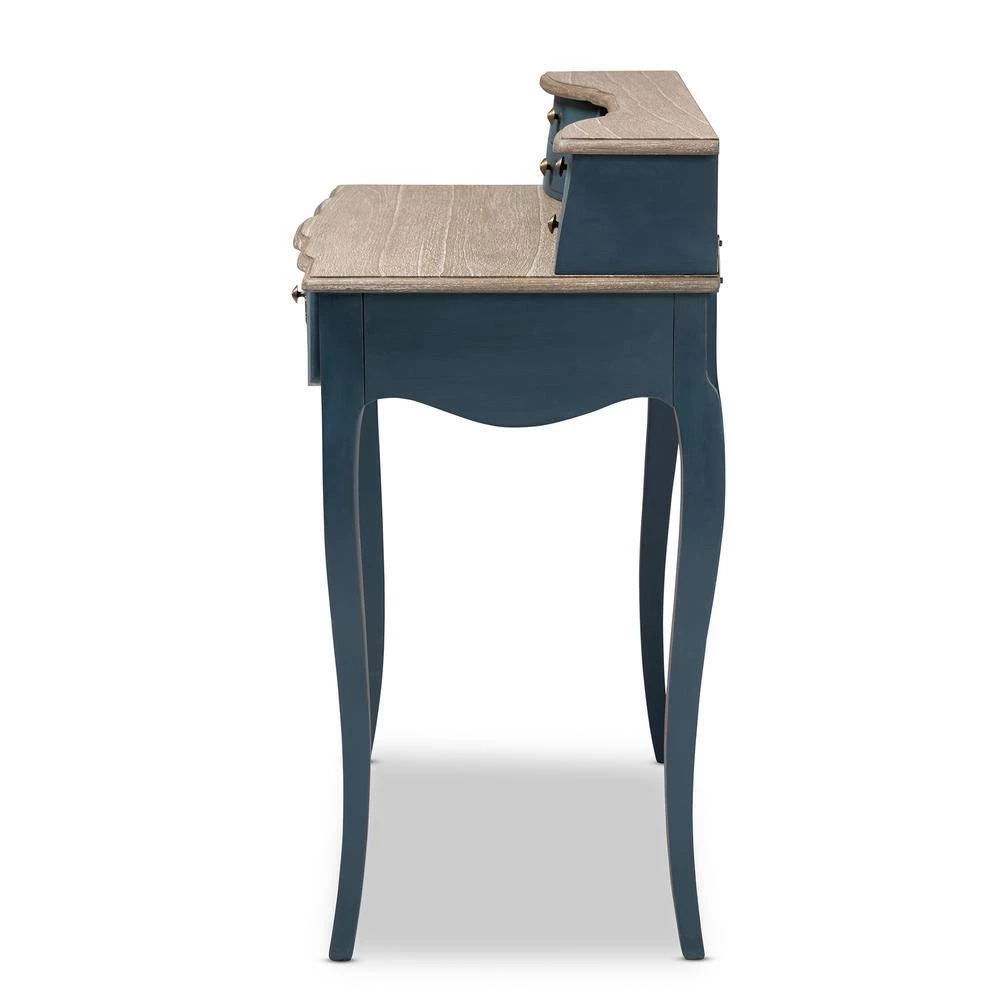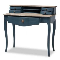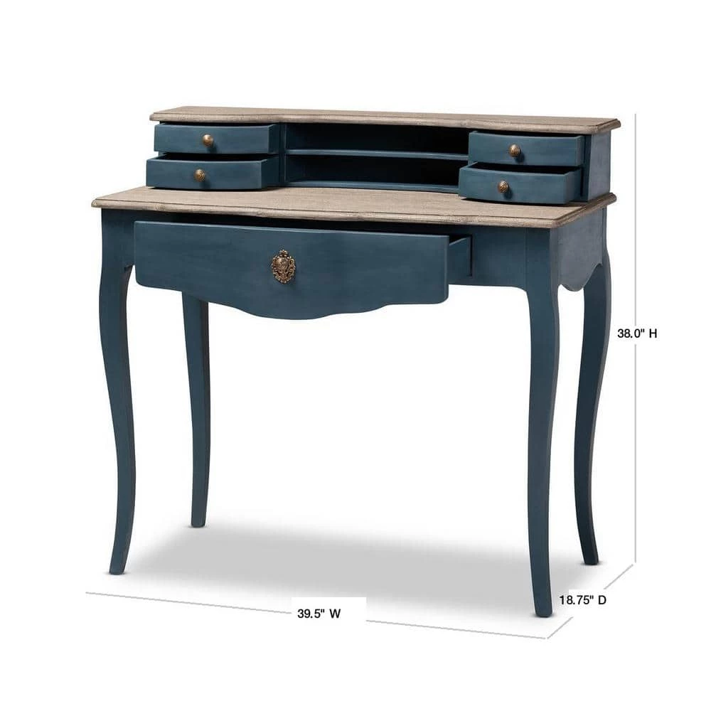A classic French silhouette is combined with a rich blue finish to give the Celestine writing desk a uniquely contemporary elegance. This stunning piece of furniture is crafted from Bayur wood in a rich blue spruce finish that is complemented by the white-streaked natural veneer tabletop. Its traditional French inspired design features graceful saber legs and carved brass drawer knobs. Designed to add both beauty and function to your space, the Celestine is fitted with ample storage capacity. One large drawer provides space to store folders and documents, while four smaller drawers and two shelves provide storage space for writing utensils and stationary. The Celestine writing desk is made in Indonesia and requires assembly.