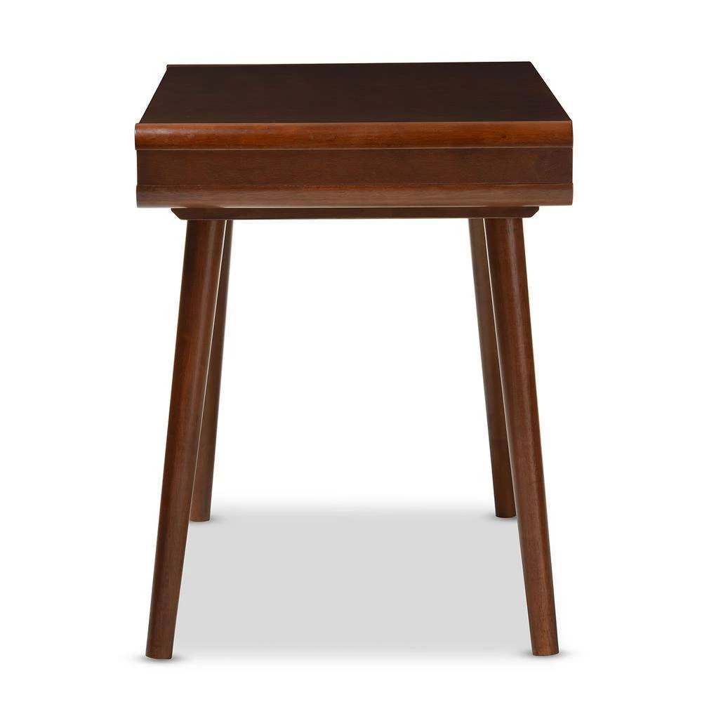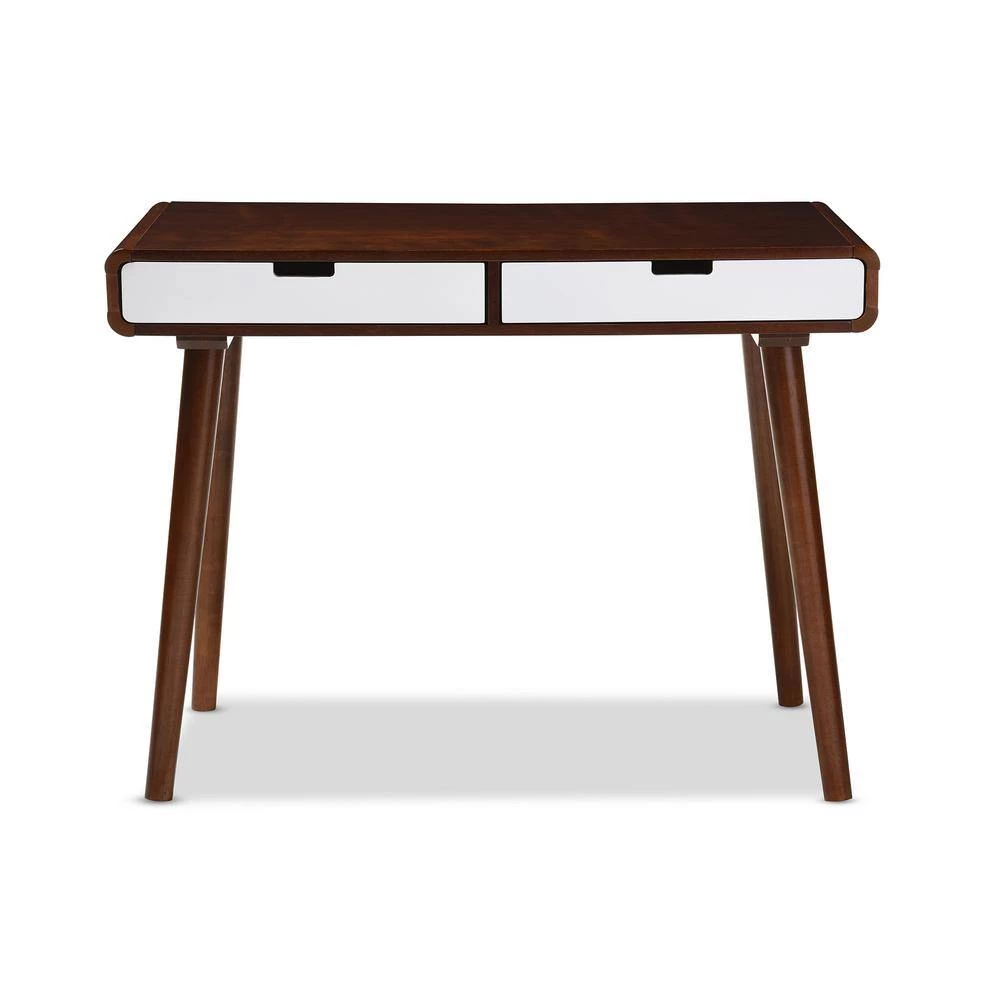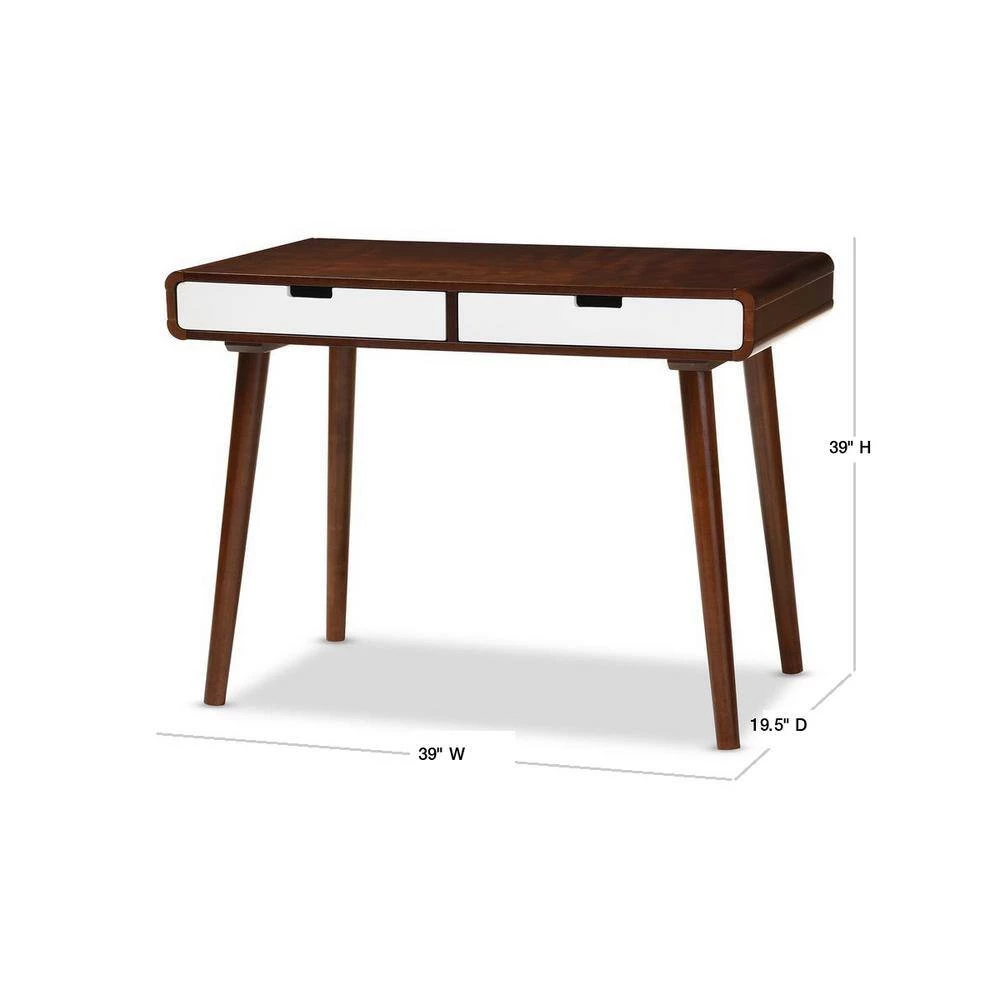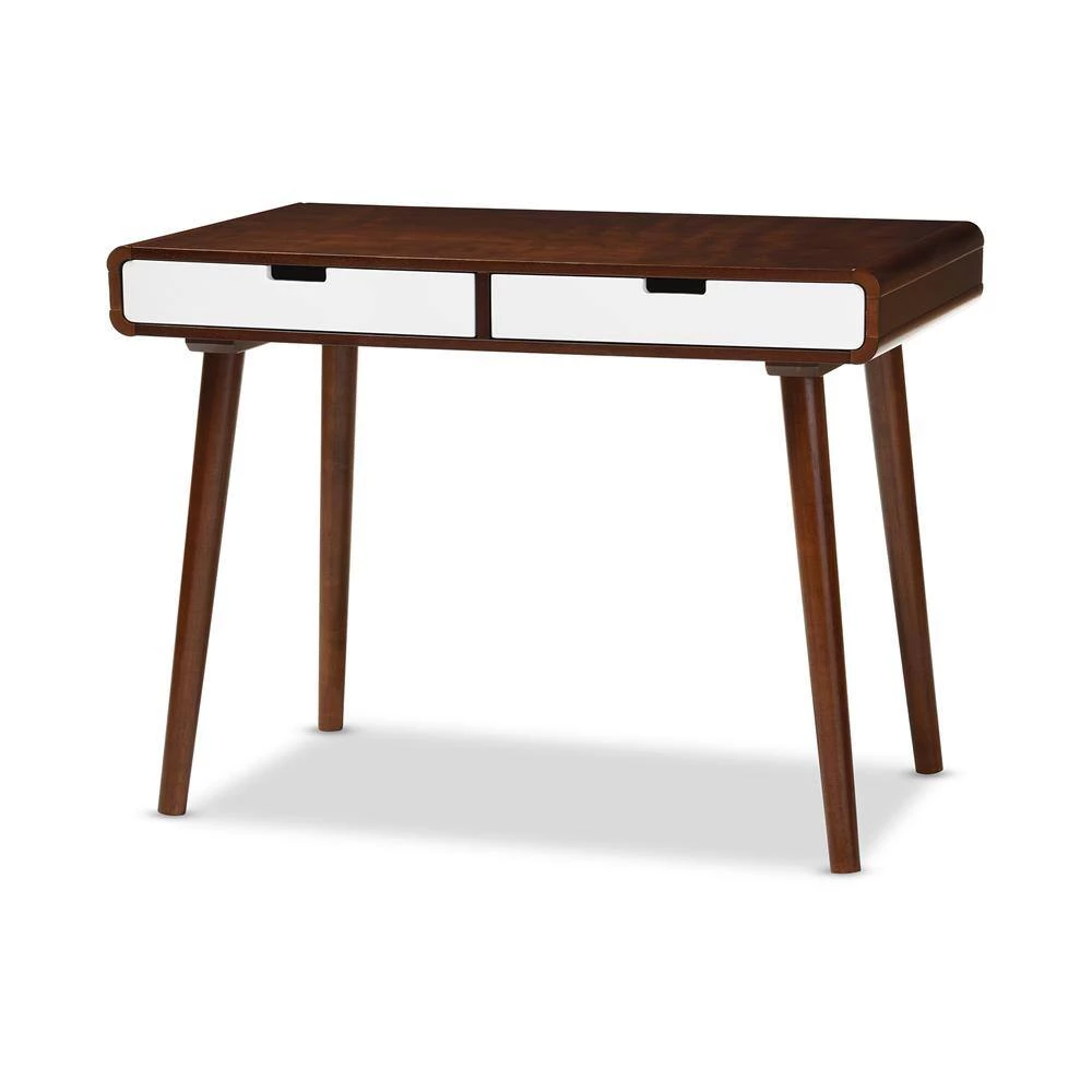 Mid-century modern style has been breaking the rules and setting fashion trends since it came into popularity in the ’50s, and now its back in a big way. Used both office and home settings, the Casarano writing desk fits exceptionally well into tight spaces. The spacious airy feel of the desk is attributed to four of its tall splayed legs which raise the body of the desk off the floor occupying minimal space both physically and visually. The dark walnut veneer finished desk surface provides a clean sharp work surface, a defining contrast to the two drawers in white. The Casarano respectfully takes into consideration the colors, rounded lines design and the size of the desk, allowing it to be used as a writing desk in your home office or as a console table at the entry way. The dark walnut wood veneer over the solid rubberwood and solid wood legs are finished to a beautiful, natural luster. Made in Malaysia, the Casarano requires assembly.