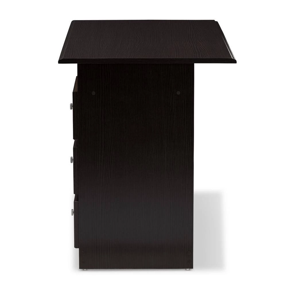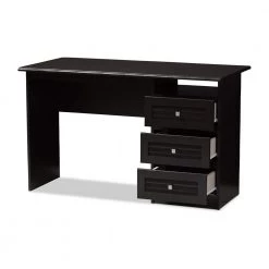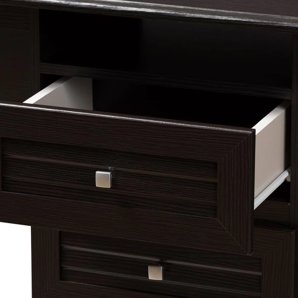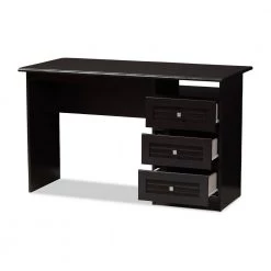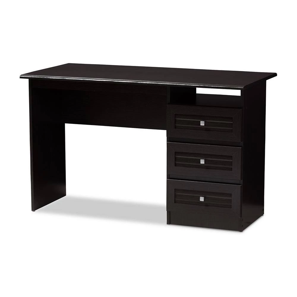 The Carine desk has a classic, modern look that looks right at home in your office. The modern and contemporary-inspired design is simple and sophisticated. The Carine is finished in a wenge brown and has modern square knobs in a silver finish. The desk features three convenient pull out drawers with a framed horizontal slatted design on their fronts. The Carine also features an open compartment on the right hand side of the desk, perfect for extra storage or managing cables. The practical, open workspace of the desk makes this an ideal addition to your private office, home office, den, or study. Made in Malaysia, the Carine requires assembly.