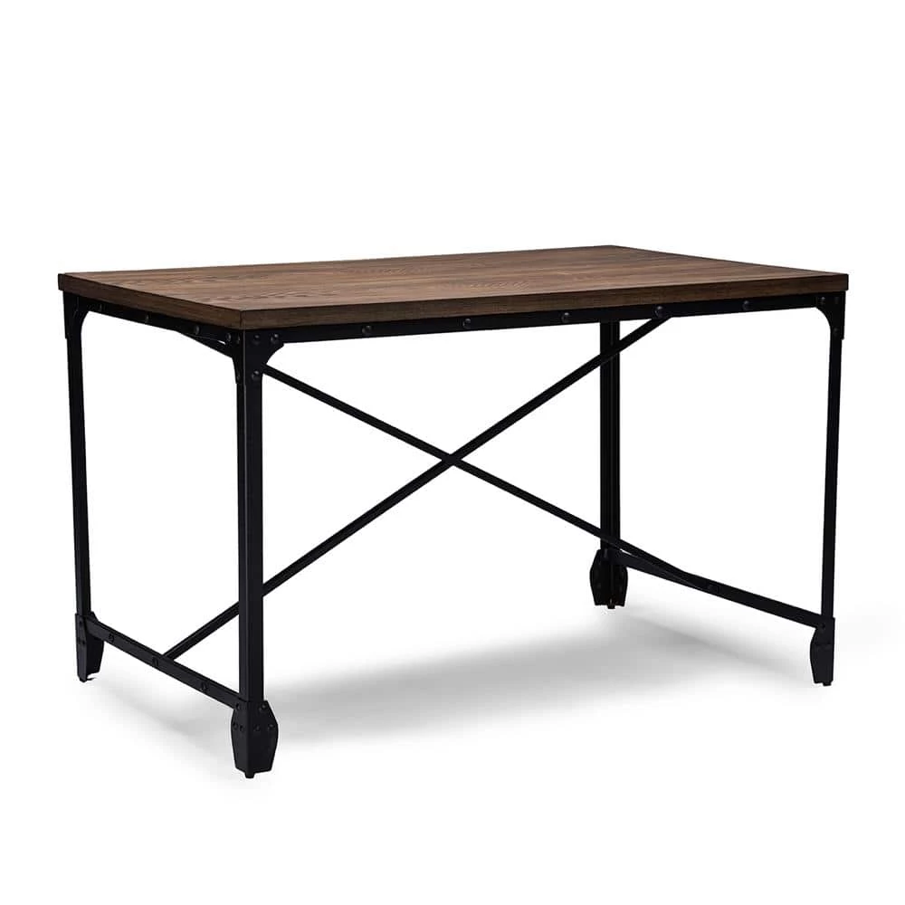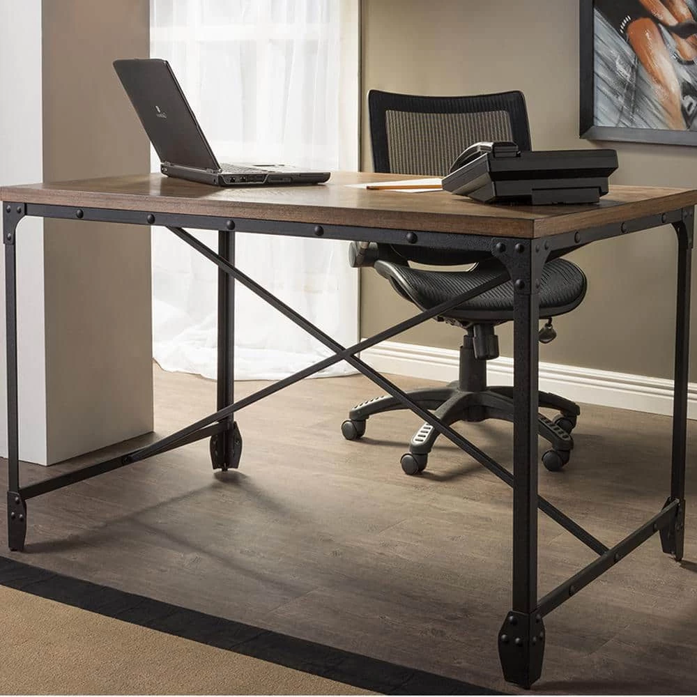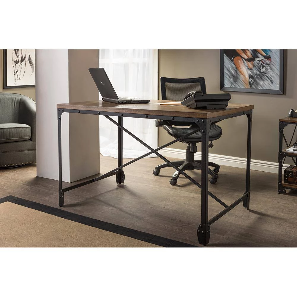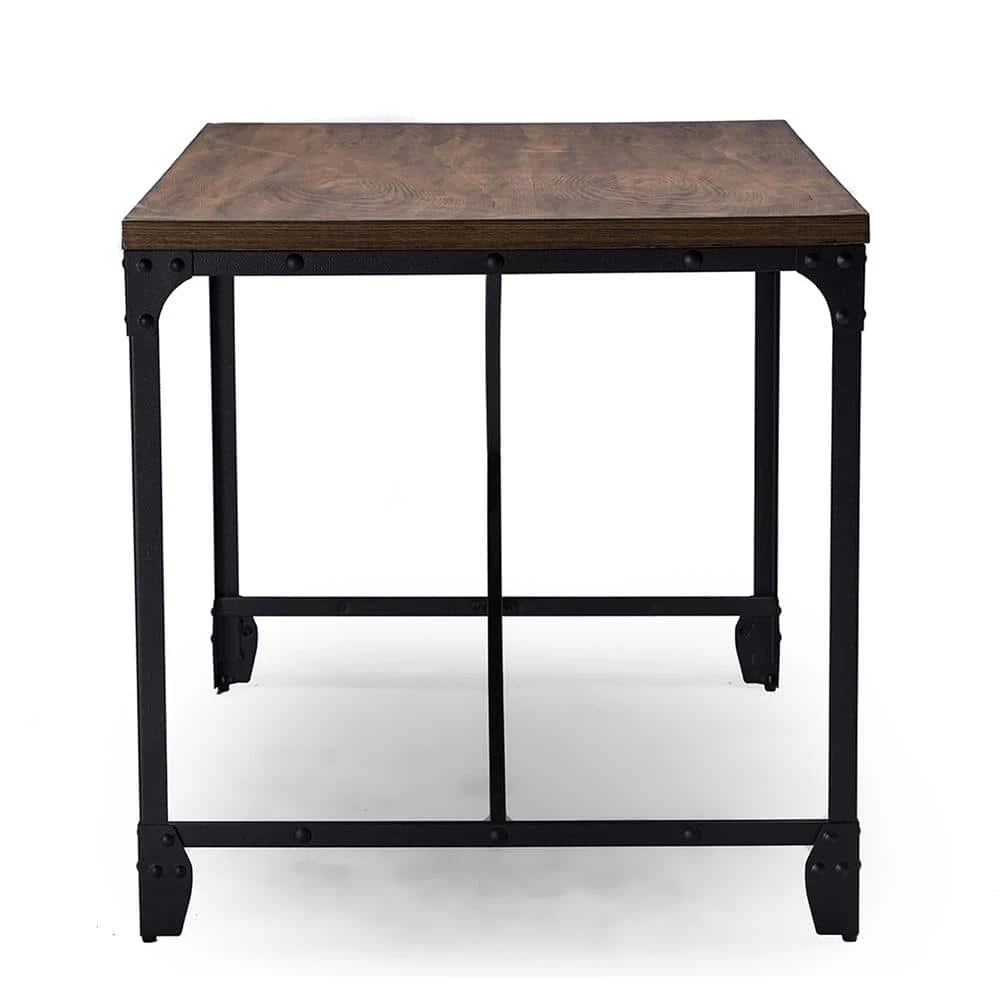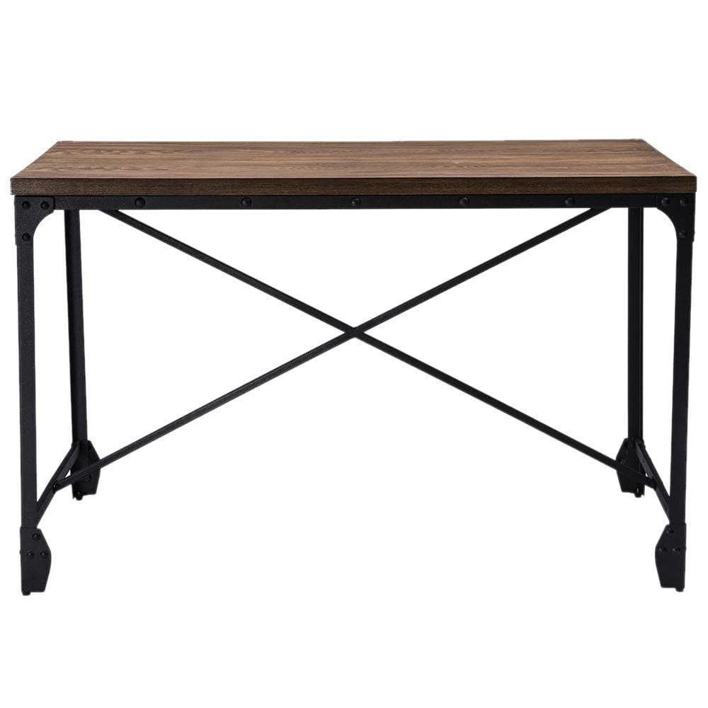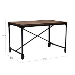 Pairing iron metal frame with distressed finishing wood board, this table is a striking centerpiece for your home office. Rustic oak wood grain textured top and the distressed finishing lend a vintage look to the thick top. Combined with the metal frame and the classic detailing of industrial furniture, this is solid and sturdy piece for years to come. Made in China, the desk requires assembly.