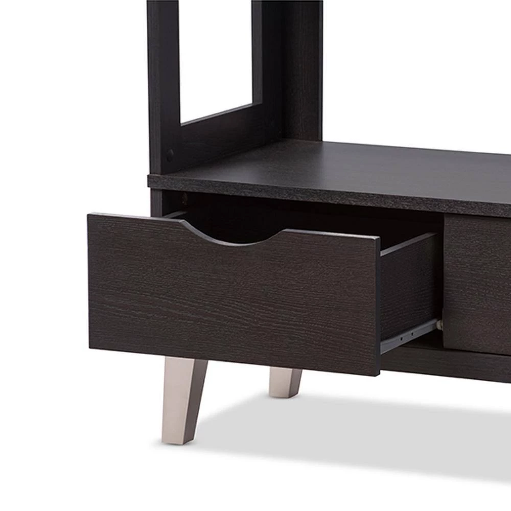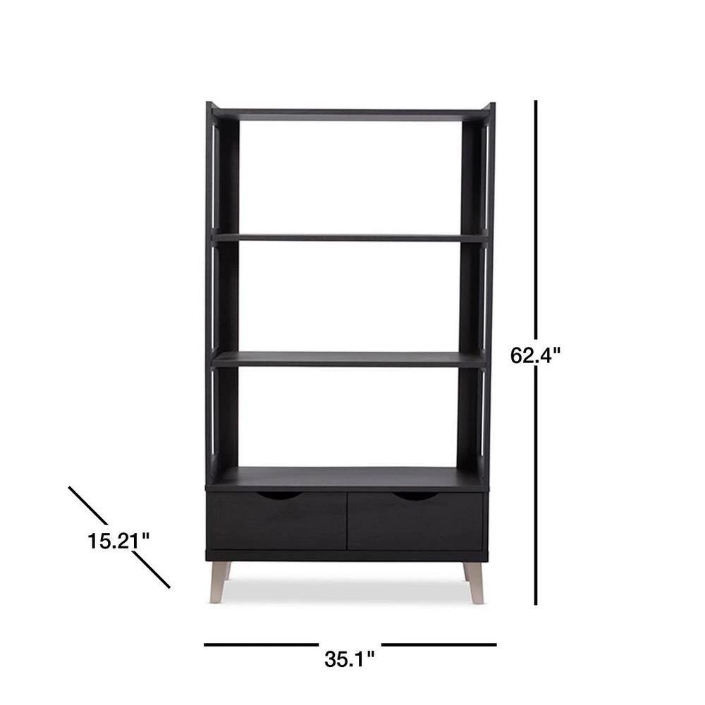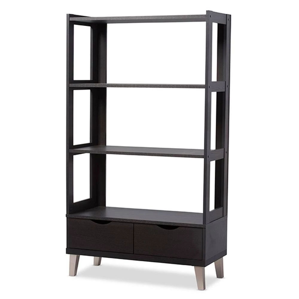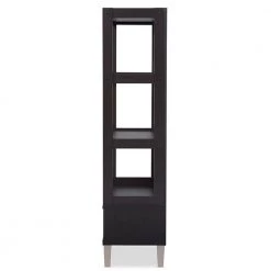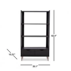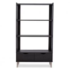 Simple and architectural, the Kalien Dark Brown Wood Leaning Bookcase is reminiscent of modern and contemporary design. The Kaliens clean and functional design features powder coated vinyl legs supporting the framework of the bookshelf. 2-generous sized storage drawers and three large open shelves are built in across the horizontal span of the bookshelf providing storage solution for a better living. Crisp, clean lines and finger grooves drawers give the shelf an effortless character and charm. The bookshelf, constructed of engineered wood and finished in dark brown finishing will match with your modern interior decor. The Kalien, could be placed in your living room or home office, provides ample storage space for your display items, books, pictures and accessories. Made in Malaysia, the study desk requires assembly.