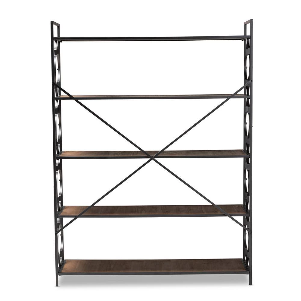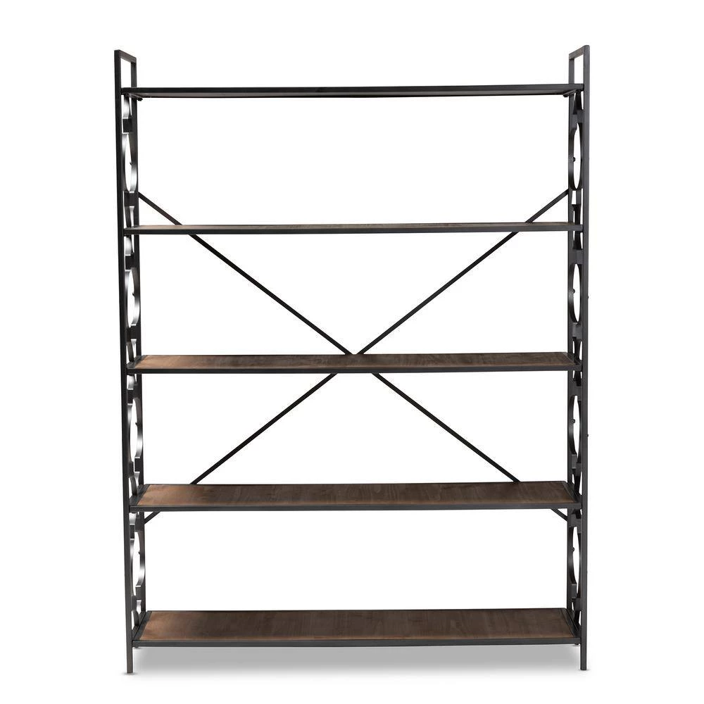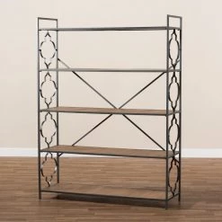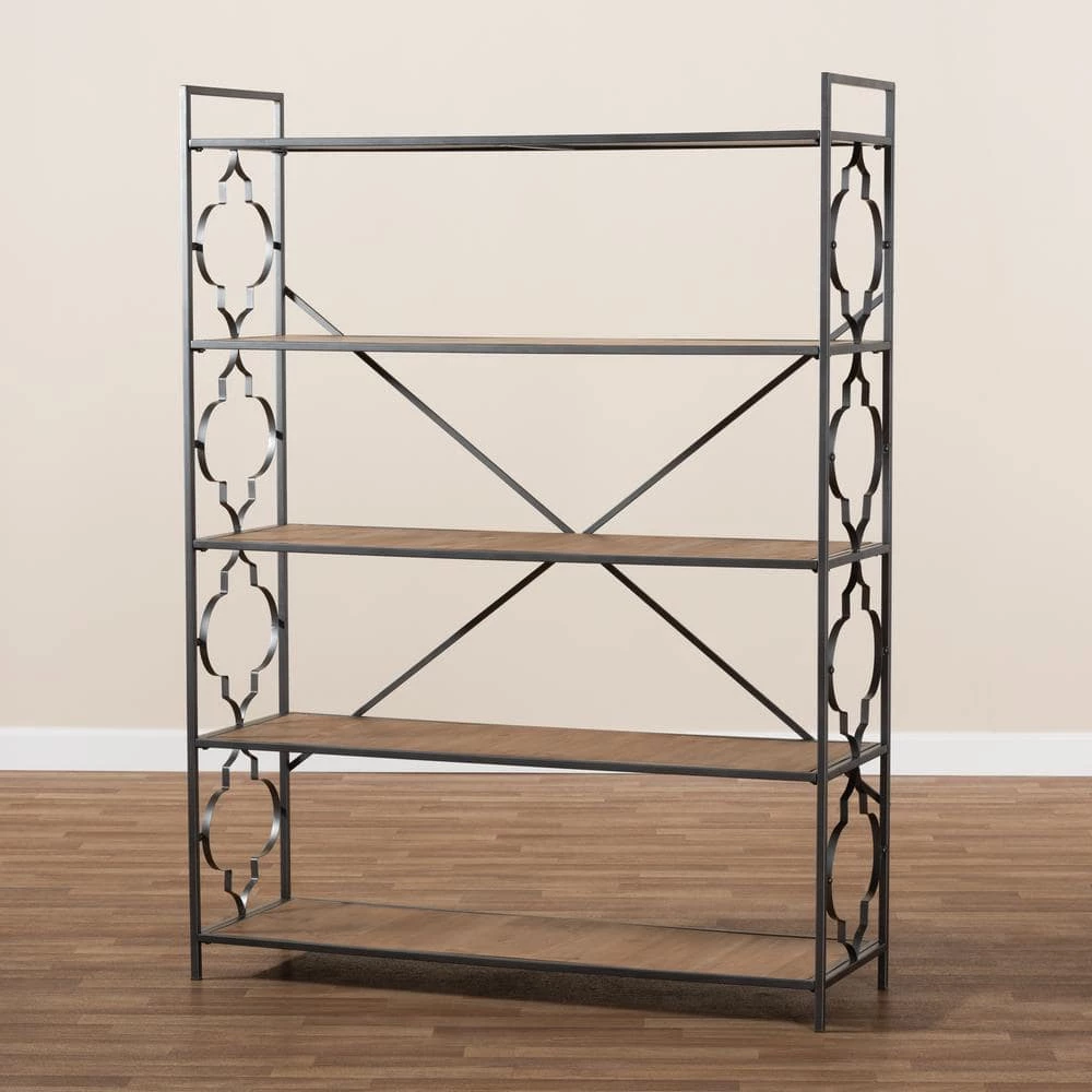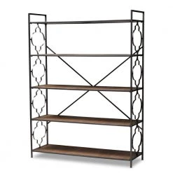 Spacious shelving and exquisite quatrefoil accents make the Mirna bookcase a chic addition to any space. A sturdy black iron metal frame supports five large shelfs crafted from MDF wood, ideal for displaying books, pictures frames, and more. Quatrefoil embellishments on the sides of the bookcase add a decorative touch, while a crisscross stretcher on the back of the bookcase provides structural support. The Mirna bookcase is made in China and requires assembly.
