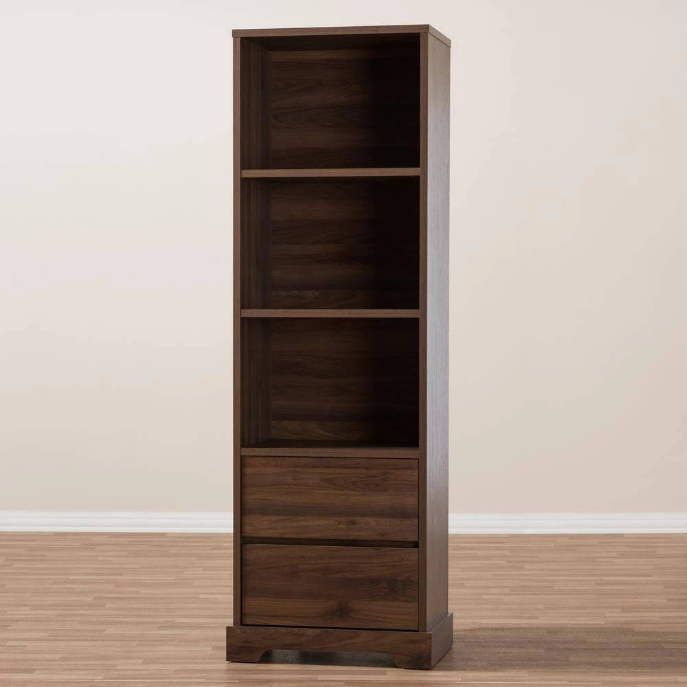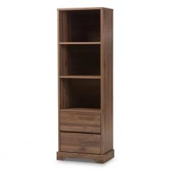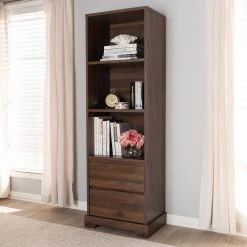 Create elegant accents with your office essentials with the Burnwood bookcase. Ideal for the bedroom, study room or office, the understated appearance of the Burnwood bookcase lends a sense of simple refinement to any space. Three wide shelves provide ample room for textbooks, ledgers and ornaments alike, while the two lower drawers provide concealed storage for privacy. Warm walnut finished veneer over the MDF boards and engineered wood makes the Burnwood bookcase an eye-catching addition to your home or office. Stock your shelves with a mixture of books, framed photos and a vase of bright blooms to make the best use of this practical and decorative piece. Made in Malaysia, the Burnwood requires assembly.