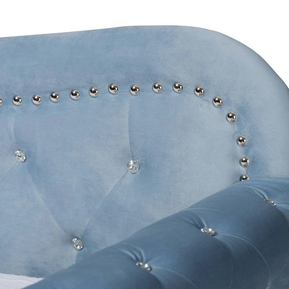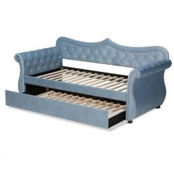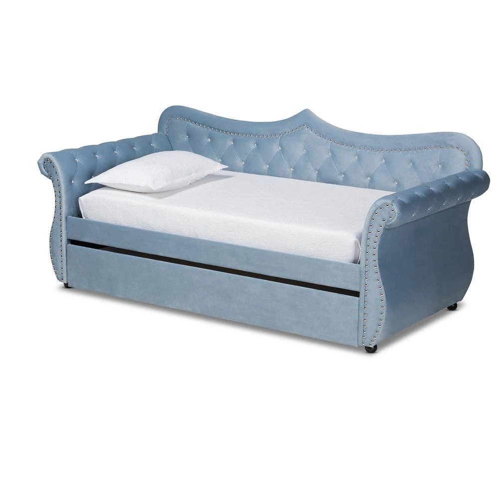 Lounge and sleep in glamorous style with the Abbie daybed. This versatile piece is fitted with a pull-out trundle to provide convenient accommodation for overnight guests. Its sturdy wooden frame is padded in foam and upholstered in a soft, sumptuous velvet fabric that provides ample comfort for resting. Crystal tufting adds charm, while silver metal nailheads accentuate the sweeping curves that define the elegant silhouette. The Abbie daybed is made in Malaysia and requires assembly.