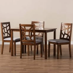 With an asymmetrical back and beautiful, sturdy construction, the Abilene dining chair takes the guess work out of putting together a stylish gathering place. This set of two chairs features walnut wood finishing over eco-friendly solid rubberwood. The seats are padded with foam for comfort and upholstered in a grey polyester fabric. The minimalist yet sophisticated table is finished in a chic dark brown. Made in Malaysia, the Abilene requires assembly.