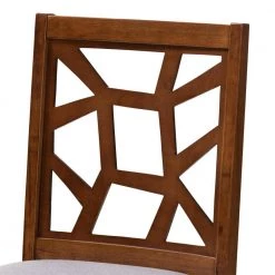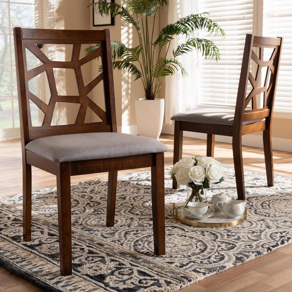 With an asymmetrical back and beautiful, sturdy construction, the Abilene dining chair takes the guess work out of putting together a stylish gathering place. This set of two chairs features walnut wood finishing over eco-friendly solid rubberwood. The seats are padded with foam for comfort and upholstered in a grey polyester fabric. Made in Malaysia, the Abilene requires assembly.