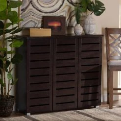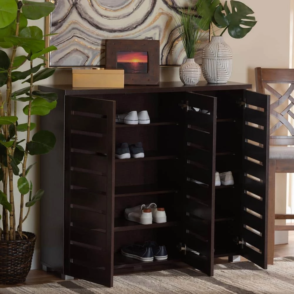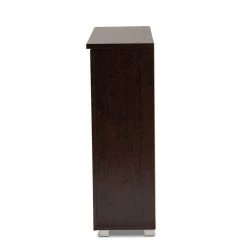 Start organizing your collection of shoes with this practical shoe cabinet. Featuring dark brown PU veneer finish, PVC legs in silver powder coated and a sleek stylish contemporary design, this quality made shoe cabinet easily matches any decor. It features slatted doors and four fixed shelves that stores up to 20 pairs of shoes. Great for organizing your favorites, just perfect for your storage needs. Adalwin shoe storage cabinet is made with open slat doors allowing air circulation which is essential for the storage of shoes helping to keep them mold free. Made in Malaysia, the shoe storage cabinet requires assembly.