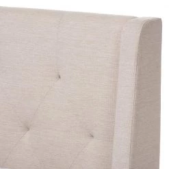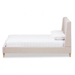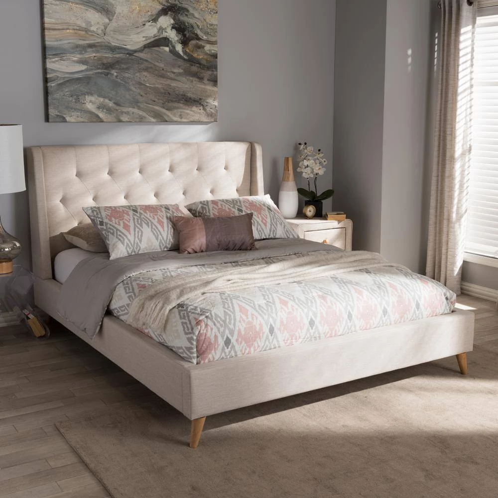 Resonate a resurgent aesthetic in your bedroom with the wingback frame and luxe upholstery of the Adelaide queen size platform bed. Constructed of solid wood and plywood frame with MDF for a strong and sturdy structure, the Adelaide features wood legs for ultimate sturdiness and a superior support structure. Upholstered in quality blend of polyester fabric with resilient quality to last over the padded bed frame, the wood slats provide ample support to your mattress while the structure is screwed together for stability. Attached headboard provides a supportive backboard to your bedding as well as a stylish button-tufting feature to give indulgent good looks to your bedroom. Wingback design for mid-century modern style-lines and tapered, natural finishing legs to give resurgent accents to your contemporary aesthetic. Neutral hue in a light and uplifting oatmeal tone for effortless style to complement your modern bedroom with its lasting good looks. Made in Malaysia, the Adelaide requires assembly.