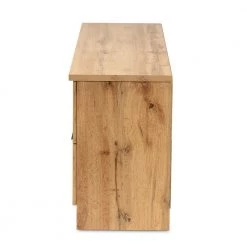 Sleek and practical in its design, the Adelino TV stand effortlessly arranges your living room with modern charisma. Made in Malaysia, this TV stand is crafted from natural oak brown finished wood that creates a stunning focal point rich with visual warmth. Four dropdown doors fitted with glass reveal convenient shelves to organize media devices and electronics, while two spacious drawers provide secure storage space. Requiring assembly, the Adelino features two cord management holes on its back panel for quick and easy setup. Providing ample space in contemporary style, the Adelino TV stand enhances the layout of any living room.