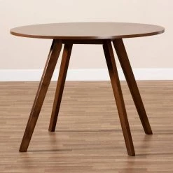 Modest and efficient design make the Alana dining table a refined addition to any space. Made in Malaysia, the Alana is constructed from durable rubberwood and comfortably sits up to four. A round tabletop finished in a striking walnut brown gives the Alana a mid-century charm while providing ample elbow room to each member of the table. The Alana requires assembly and is supported by splayed legs that add retro appeal. Featuring a compact size, the Alana dining table is well suited for areas with limited space.