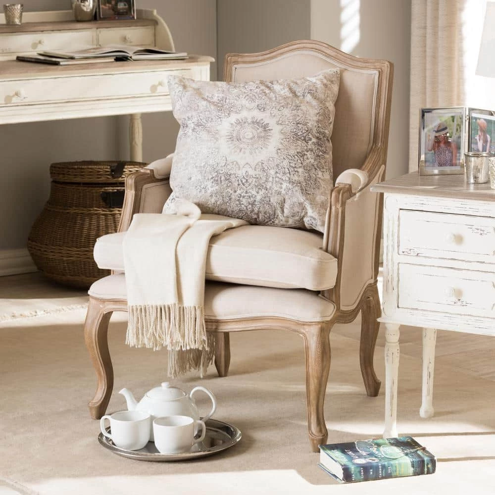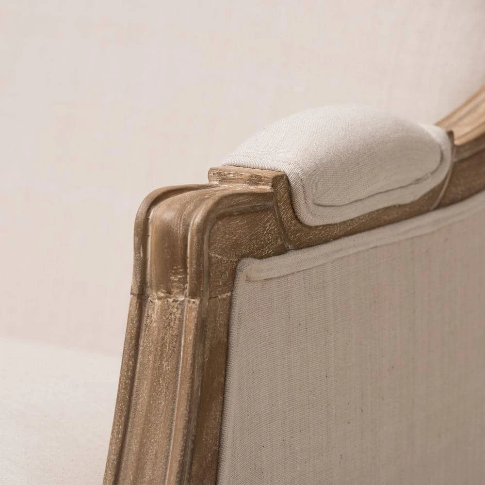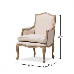 Revealing outstanding attention to detail via its white-streaked, distressed antiqued finish, our Nivernais Wood Traditional French Accent Chair will gain enthusiastic applause from discount-minded decorating divas. Bringing traditional style to the modern age, this accent chair pairs a genuine mindi-wood frame with Highly versatile neutral beige linen. Foam cushions provide comfort without sacrificing style.