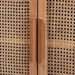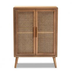 Cultivate a fresh, retro feel in any space with the Alina cabinet. This sturdy wood cabinet showcases a medium oak finish for a look that’s both warm and inviting. Two shelves, behind two doors, provide ample space to keep items organized and out of sight. Woven rattan adds a cool, bohemian vibe, while angled legs and long wooden handles lend mid-century charm. The Alina cabinet is made in China and requires assembly. This is a product of nature and may have variations in areas such as, but not limited to, color, pattern, grain and texture. The hair-like strands of rattan/rattan-fiber are common due to nature of the material.