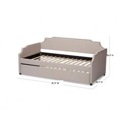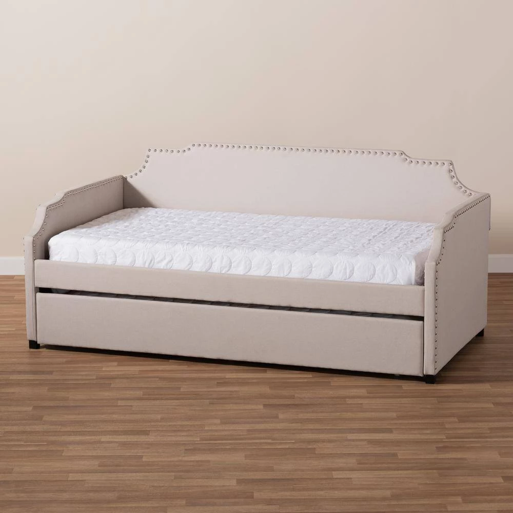 Featuring a roll-out trundle bed, the Ally daybed can easily transform any space from living room to bedroom. Constructed from solid rubberwood and MDF wood, the Ally is foam-padded and upholstered in an elegant neutral fabric for easy coordination with a wide range of color palettes. The daybed is fitted with a pull-out twin size trundle, providing convenient accommodation for guests. Designed with both function and style in mind, the daybed features an elegant cut-out frame accented with chrome nailheads for a touch of glamour. This dynamic-piece for furniture will allow you to maximize your space without sacrificing style. The Ally is made in Malaysia and requires assembly.