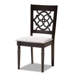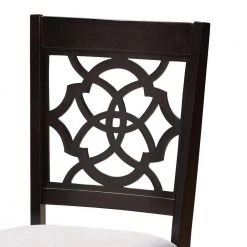 Elegant design marries quality craftsmanship in the Alma dining set. Made in Malaysia, this wooden set includes 1-table and 4-chairs, each upholstered in a light fabric that complements the dark brown wood finish. Designed with both comfort and style in mind, each chair features a plush foam-padded seat, as well as a striking cut-out design on its back. The round tabletop is supported by an intersecting base, creating a chic, sculptural effect. Requiring assembly, the Alma dining set is well suited for both casual and formal dining.