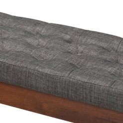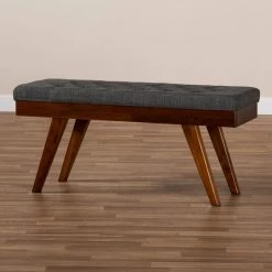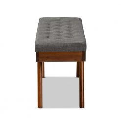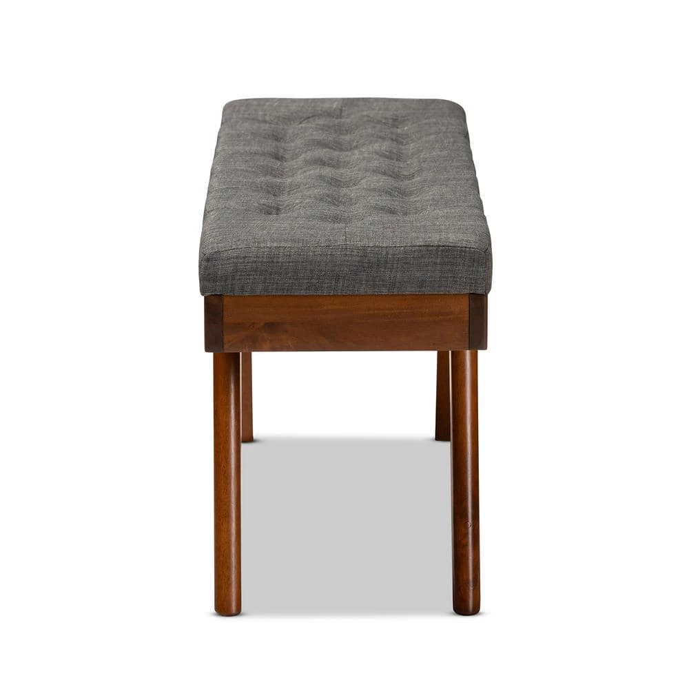 Add some visual interest to your dining room setup with the Alona dining bench. This wood bench is upholstered in a soft, grey polyester fabric that is complimentary to the walnut brown finish on the wood. Influenced by elements of mid-century modern design, the Alona features angled, tapered legs. This versatile piece works well as seating at a dining table or is equally suitable for use as an accent piece in the entryway. The Alona dining bench is made in Malaysia and requires assembly.