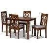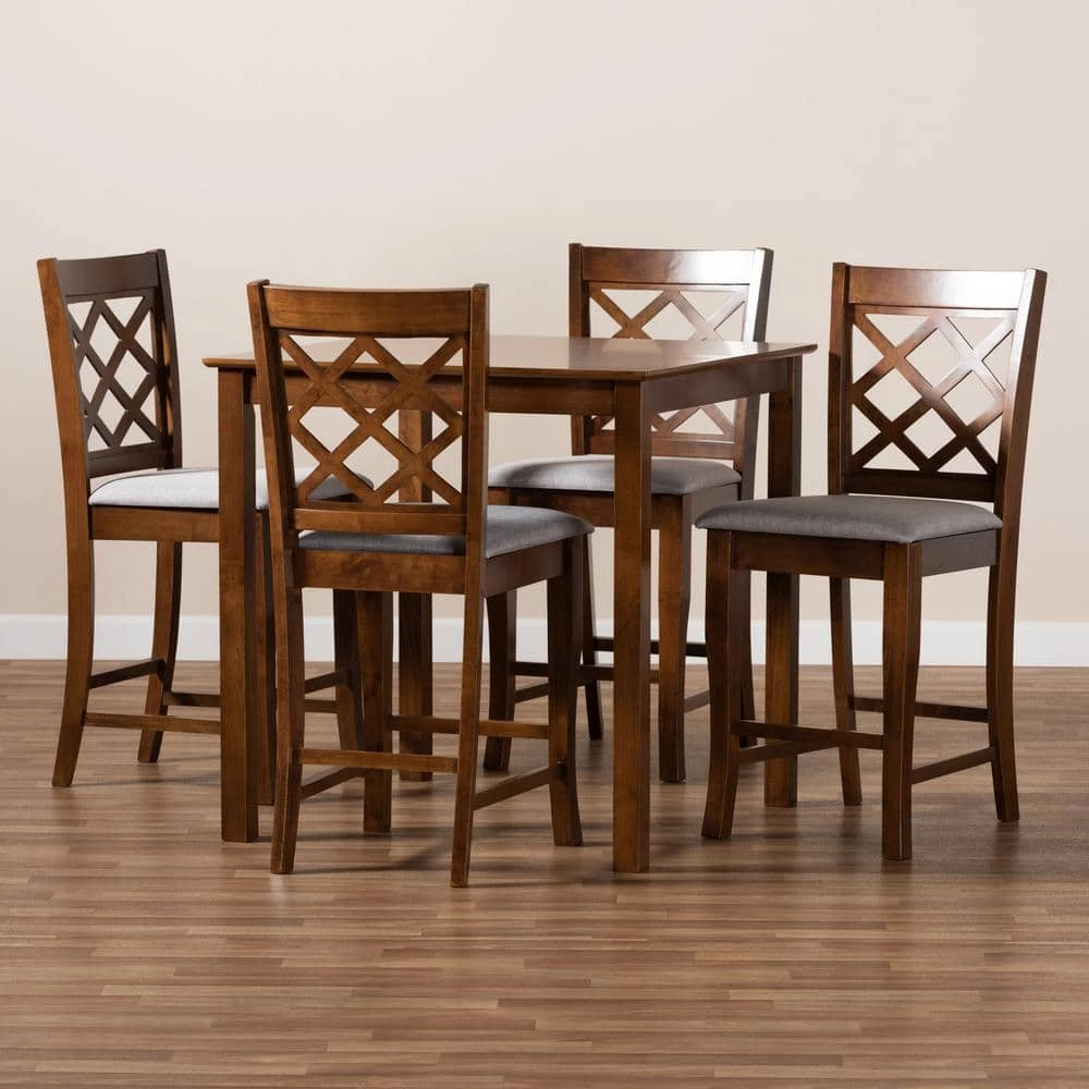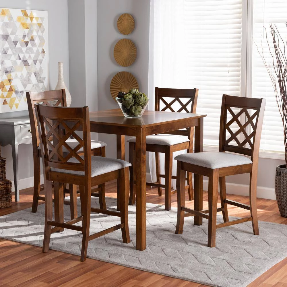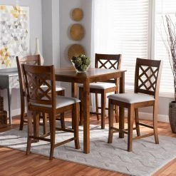 A fusion of traditional design elements and modern craftsmanship make the Alora 5-piece pub set a stunning addition to any dining space. Constructed from wood in a walnut brown finish, this pub set includes one table and four stools, each upholstered in a light fabric that complements the walnut wood finish. Padded with foam for the utmost comfort as you enjoy long dinners, each stool features a striking cut-out design on its back for enhanced visual appeal. Comfortable and stylish, the Alora set is sure to elevate any dining experience. The Alora 5-piece pub set is made in Malaysia and requires assembly.