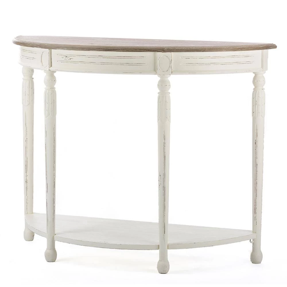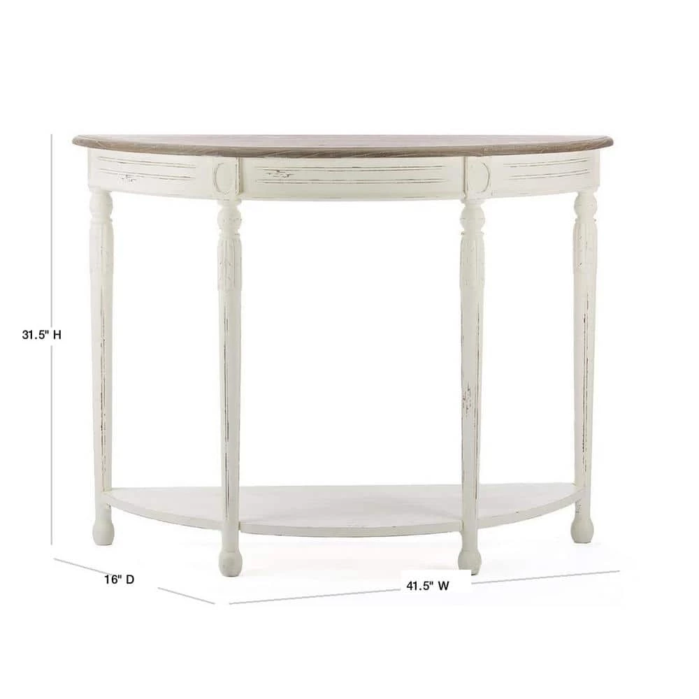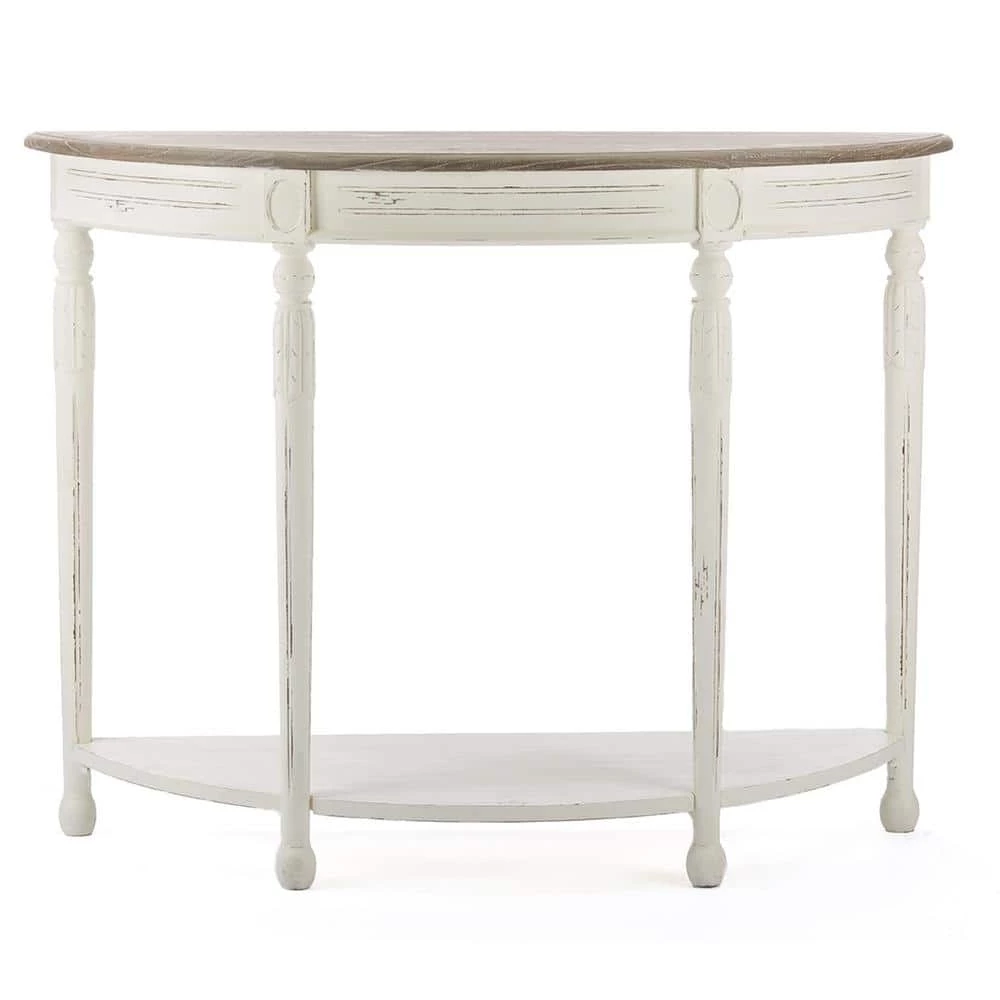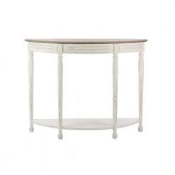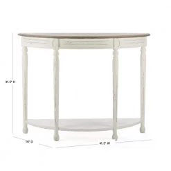 Combining European stylistic elements with genuine Southeast Asian wooden construction, the Vologne Wood Traditional French Console Table straddles the continents. This console table sports a genuine bayur wood semi-oval top and a distressed, antiqued finish complete with authentic white streaking. Distinctive styling at a discount price.