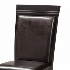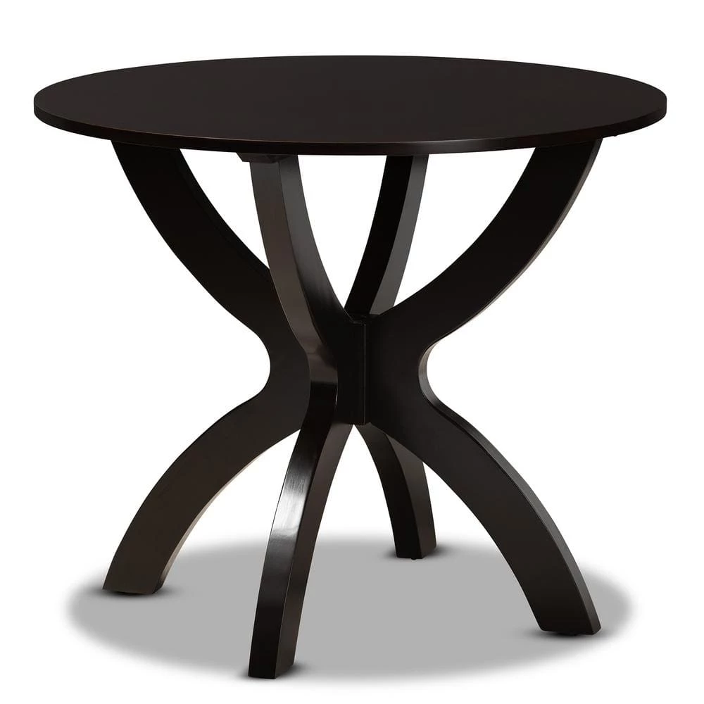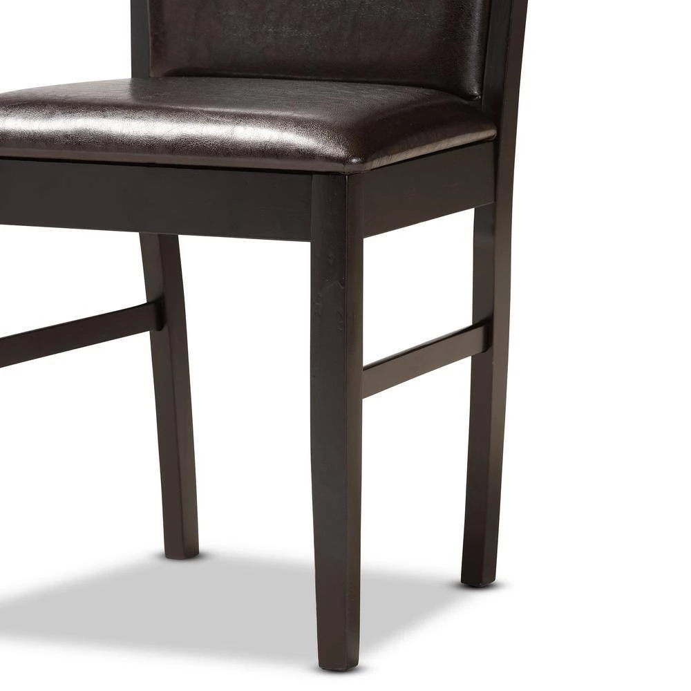 Clean lines and dark tones convey a modern elegance in the Ancel dining set. Made in Malaysia, this wooden set includes 1-table and 4-chairs, each upholstered in a sleek dark brown faux leather that matches the dark brown wood finish. Designed with both comfort and style in mind, each chair features plush foam padding, as well as inset detailing on its back. The round tabletop is supported by an intersecting base, creating a chic, sculptural effect. Requiring assembly, the Ancel dining set is well suited for both casual and formal dining.