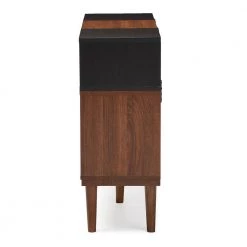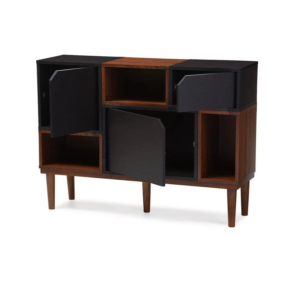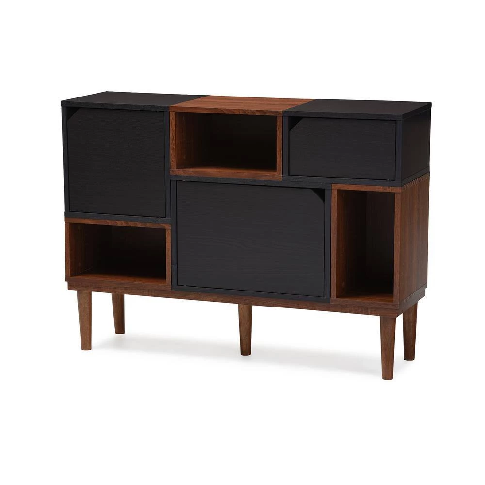 Create a space-opening display feature in your interior with the Anderson sideboard storage cabinet. Classic Scandinavian design meets quality construction in the lux looks of the sturdy oak and espresso two-tone sideboard. Its tall dimensions and array of shelving sizes adds an airy, decorative feel to handy storage. Design features three pulled-out doors in dark espresso with fixed shelving space and three oak brown finishing open shelves, stacking up in two rows, from one color finishing to another, offering a strong contrasting and balance aesthetic into your living room. Solid rubber wood splayed legs lift the cabinet off ground, providing a clearance and airy feel. Corner-cut openings add more modern touch to this piece of furniture. Made in Malaysia, the Anderson requires assembly.