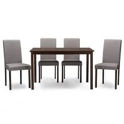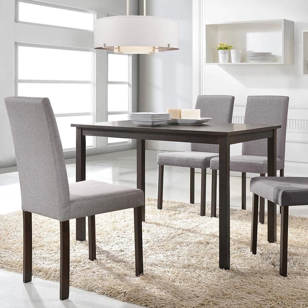 Made out of solid rubberwood and wood veneer, the Andrew 5-piece dining set would be the perfect addition to any home dining room or kitchen nook. The simple and soothing structure of the Andrew side chair is exclusively designed to enhance your experience during conversation and dining while its intelligent ergonomic offers incredible comfort and warmth. The dining chair has soft, durable fabric upholstery that generously adds comfort and espresso finishing solid rubberwood legs for a firm support.
