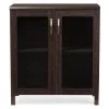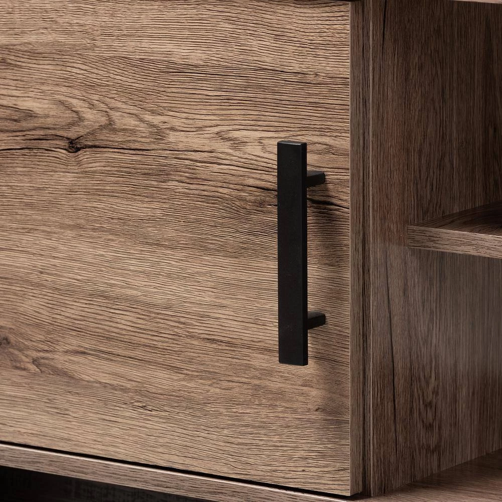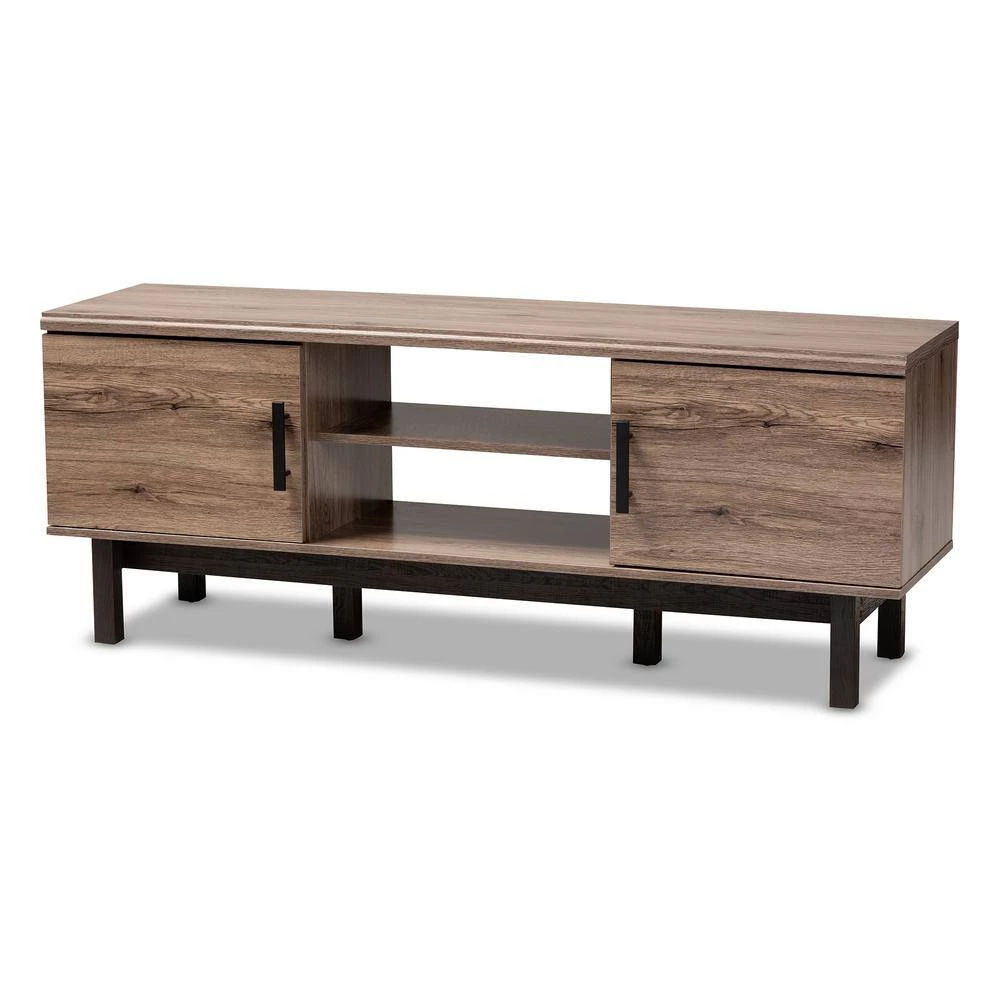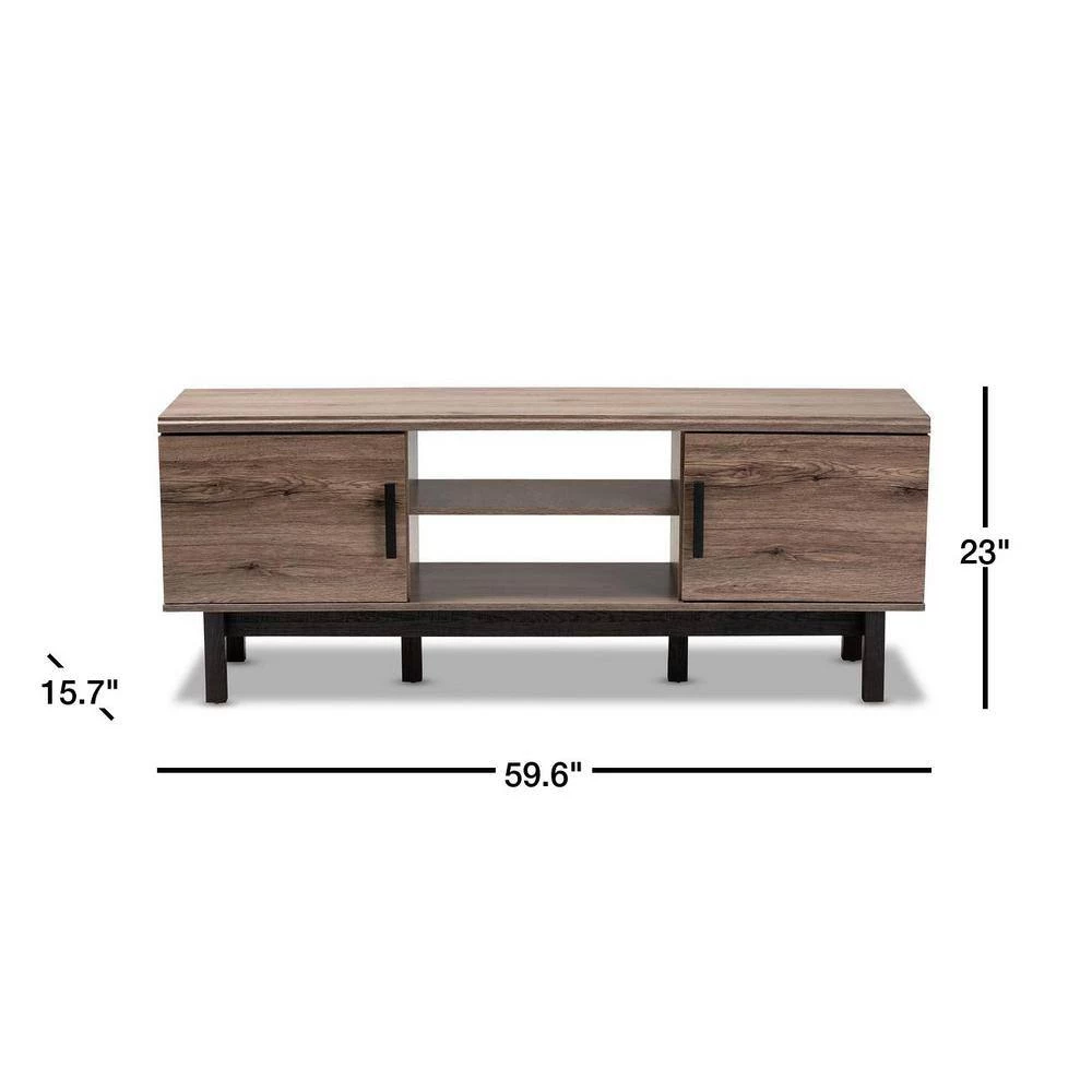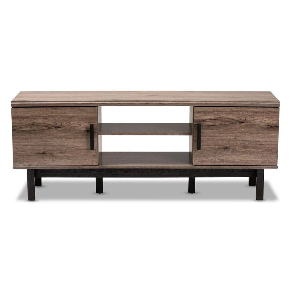 Clean lines and a display of natural wood grains make the Arend TV stand a cool addition to any space. This solid MDF wood stand is fitted with two open shelves to store DVD players, game consoles, and more. Additional storage space is provided by four shelves concealed behind a pair of doors. A stunning oak finish showcases the natural grain patterns of the wood, giving the piece a rustic touch. Dark ebony wood legs and black metal handles complete the look. The Arend TV stand is made in Malaysia and requires assembly.
