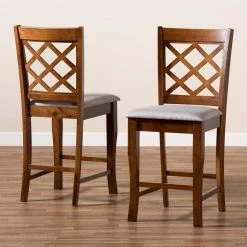 Sophisticated design and modern comfort form the Aria pub chair. Made in Malaysia, the Aria is constructed from sturdy wood in a classic square frame. The back of the chair features a diamond cut-out design, allowing light to pass through the piece and provide the room with an open, airy feel. This piece requires assembly and showcases a grey fabric upholstered and foam-padded seat to complement the warm tones of the walnut brown finished wood. Ergonomic footrests form from the legs, giving the Aria superb comfort in a contemporary style.