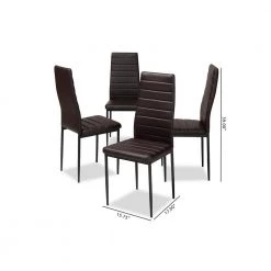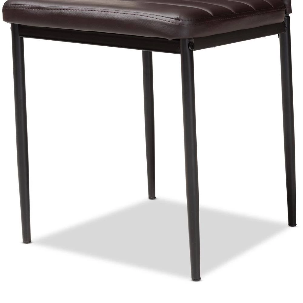 The sleek and minimalist look of the Armand dining chair will bring cool vibes to your space. The modern and contemporary-inspired design of the chair is trendy yet timeless. The brown faux-leather upholstery of the Armand is easy to coordinate with your existing decor and the horizontal, slatted chairback design amps up the clean, cool look of the chair. Black finishing on the chair’s sturdy, metal legs adds the final touch to an overall modern, streamlined look. The Armand features foam padding and a gently arched chairback to encourage hours of comfort. This chair will be the simple solution you’ve needed to add that cool, executive look to your dining room, reception area, or other shared space. Made in China, this chair requires assembly.