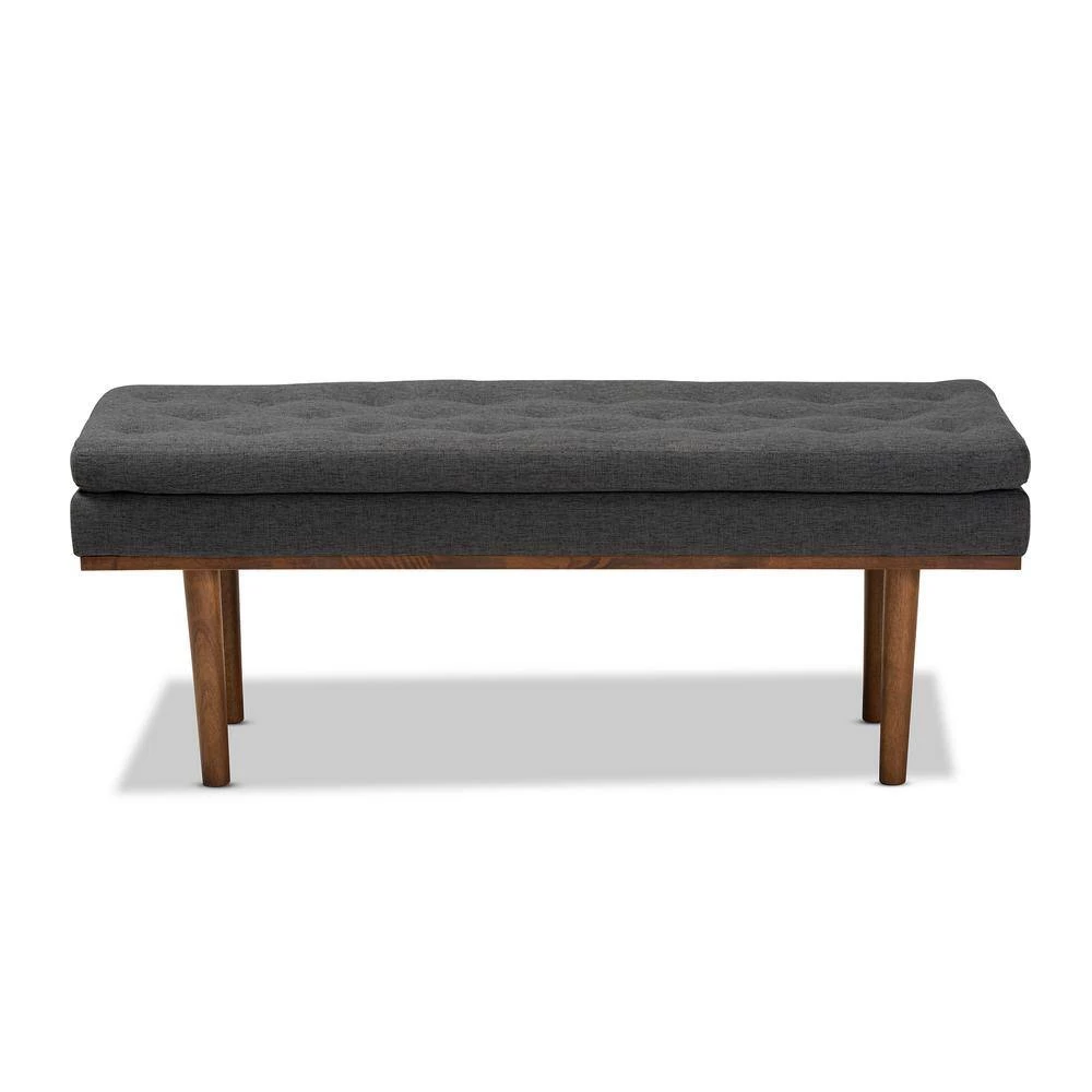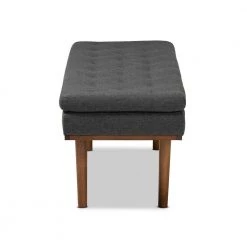 Chic and functional, the Arne bench is a sublime addition to any space. This wood bench is upholstered in a soft, neutral fabric that complements the walnut brown finish on the wood. Ample seating comfort is provided by plush foam padding. Button tufting adds a tailored look. Inspired by mid-century design, the Arne features a low silhouette and tapered legs. This versatile piece is well suited for placement in the entryway, living room, or bedroom. The Arne bench is made in Malaysia and requires assembly.