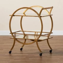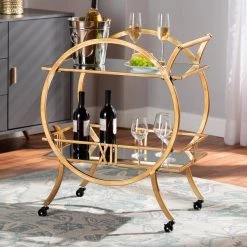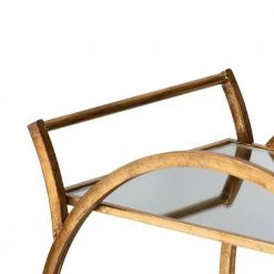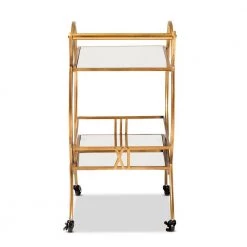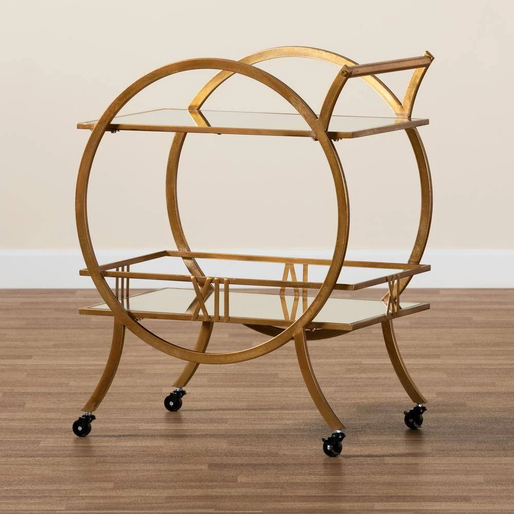 Serve guests cocktails in style with the Arsene bar cart. This durable metal cart features two mirrored glass shelves, quintessential for displaying and serving your favorite liquors. Antique gold finish on the frame adds a touch of vintage glamour. Designed with both beauty and function in mind, the Arsene is fitted with a handle and wheel casters for smooth mobility. Use the Arsene as an accent piece in the dining room or to serve guests during a dinner party. The Arsene is made in China and will arrive fully assembled.