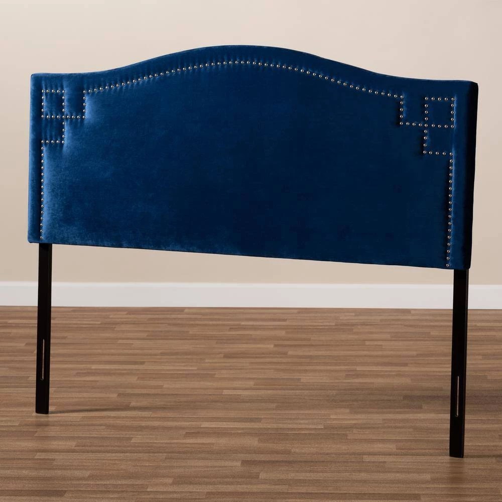 Fit for a villa in the Hollywood Hills or a lavish loft in New York, the Aubrey headboard will transform your space into a luxurious hideaway. Constructed from solid rubberwood and plywood, the Aubrey is upholstered in a soft, foam filled velvet polyester fabric that provides ample comfort for you to lean against. The edges of the headboard are embellished with a striking pattern of silver nailheads that add just the right touch of glamour. Leg supports are invisible once set up and can be adjusted to suit the height of your ensemble, for convenience. The headboard sits between the wall and the ensemble frame, attaching not to the bed base but to the legs, for stability. The Aubrey headboard is made in Malaysia and requires assembly.