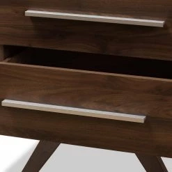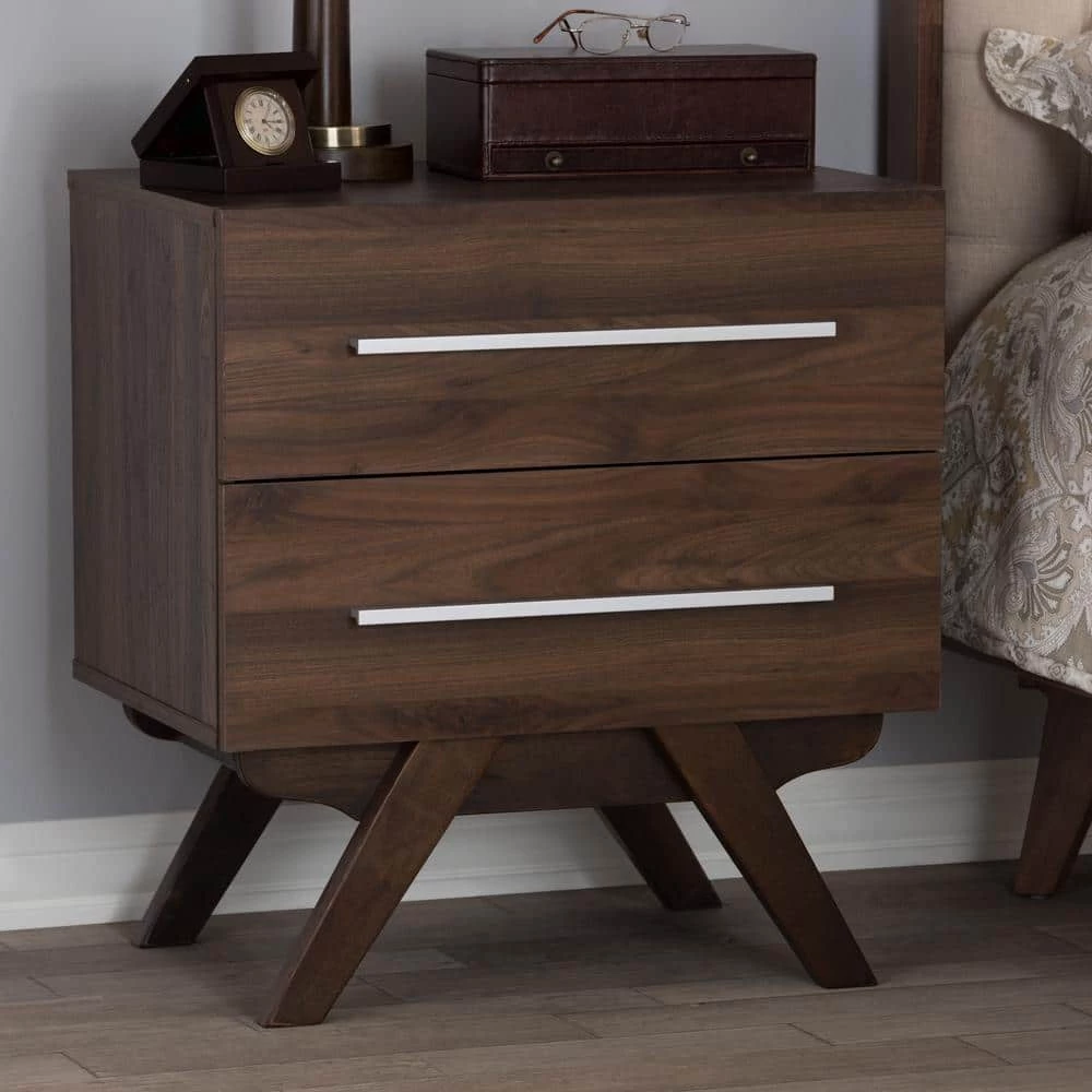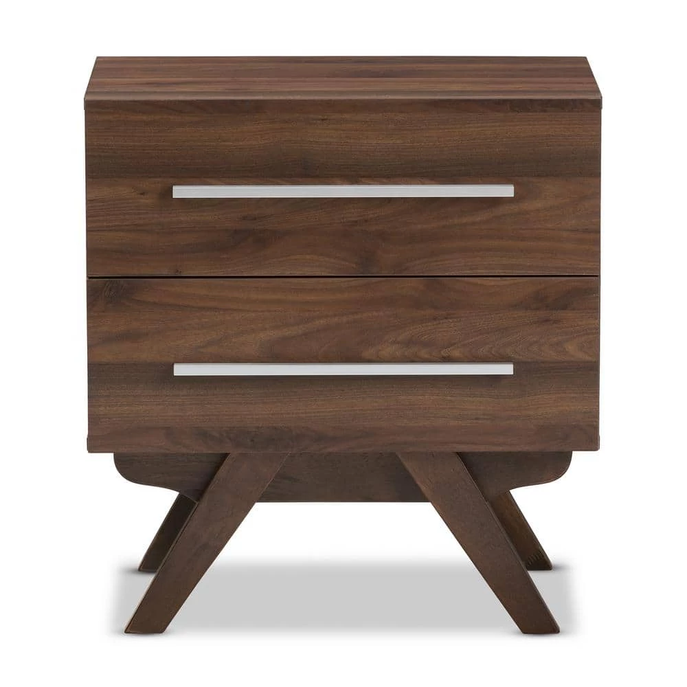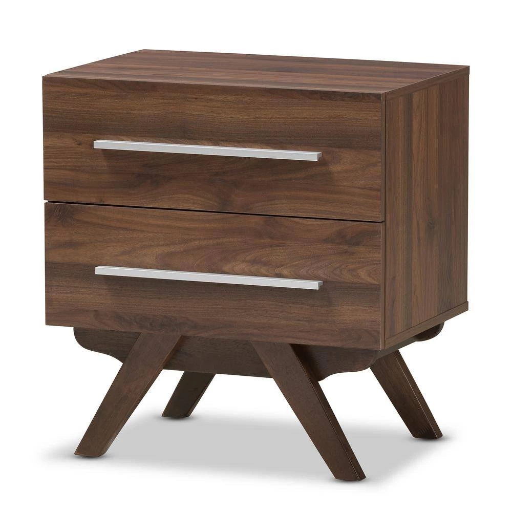 Sleek design with angular legs for sculptural design balancing, the Auburn nightstand presents your everyday space with ample storage. Constructed of engineered wood and MDF boards for sturdiness, the nightstand features two drawers, on pre-install drawer slides for your book collection or ornaments alike. Powder-coated handle offers a sleek and modern aesthetic in your space. Solid rubber wood legs provide strong structural supports. Walnut or espresso brown veneered finishing complements a range of interior palettes and styles, from retro and Scandinavian to coastal and urban styles. Made in Malaysia, the Auburn requires assembly.