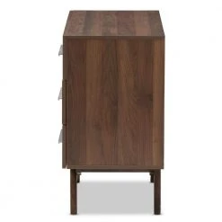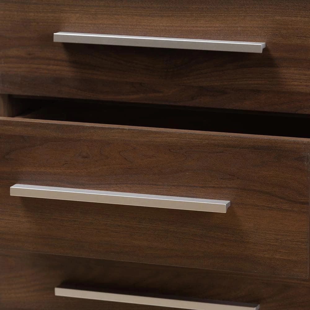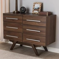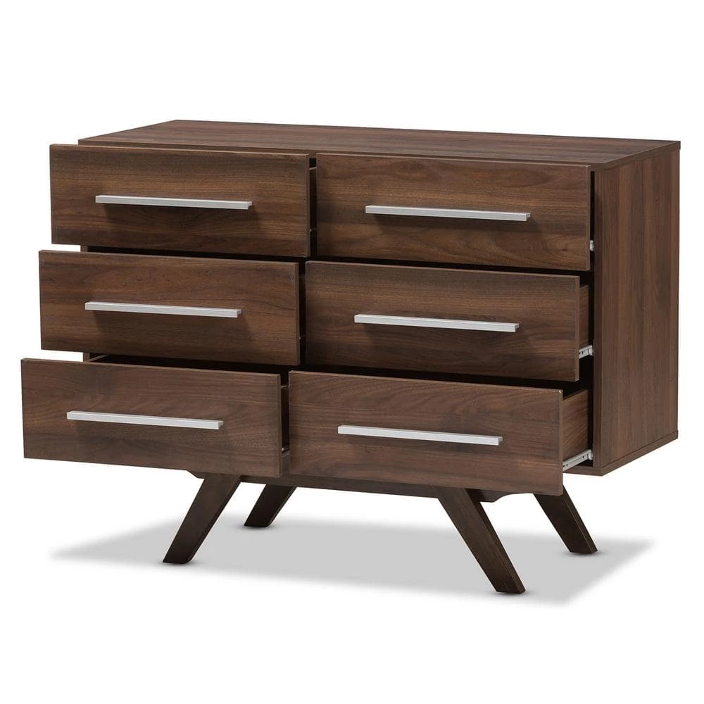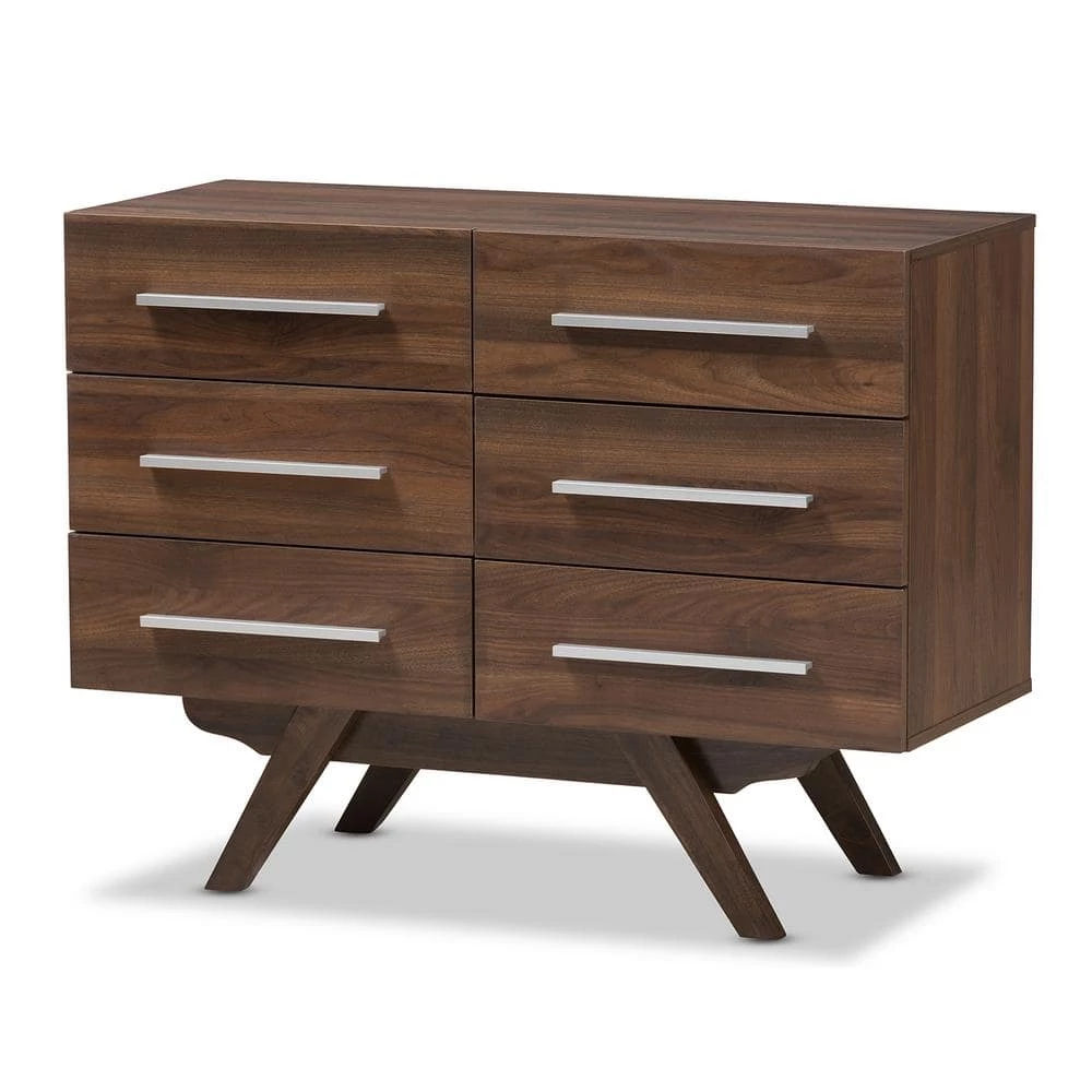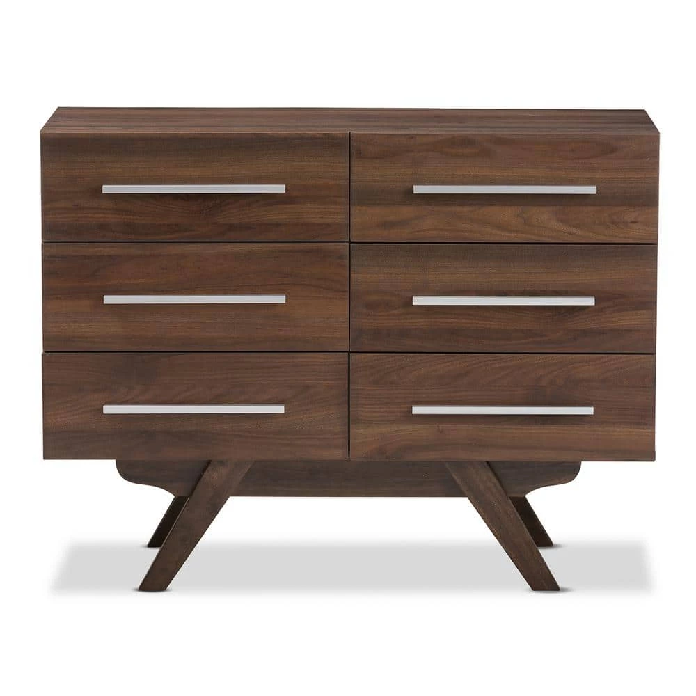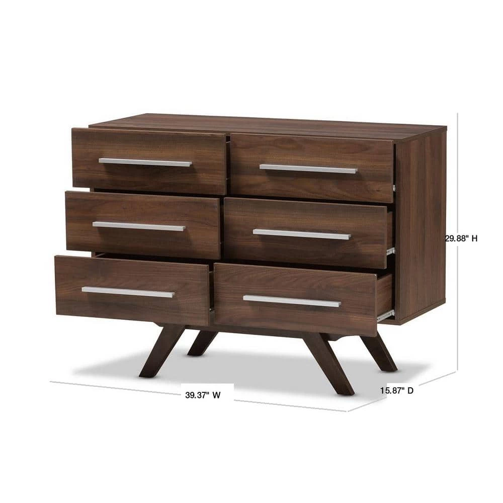 Sleek design with angular legs for sculptural design balancing, the Auburn 6-drawer dresser presents your everyday space with ample storage. Constructed of engineered wood and MDF boards for sturdiness, the dresser features six drawers, on pre-install drawer slides for your clothes and linens. Powder-coated handle offers a sleek and modern aesthetic in your space. Solid rubberwood legs provide strong structural supports. Walnut or espresso brown veneered finishing complements a range of interior palettes and styles, from retro and Scandinavian to coastal and urban styles. Made in Malaysia, the Auburn requires assembly.