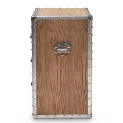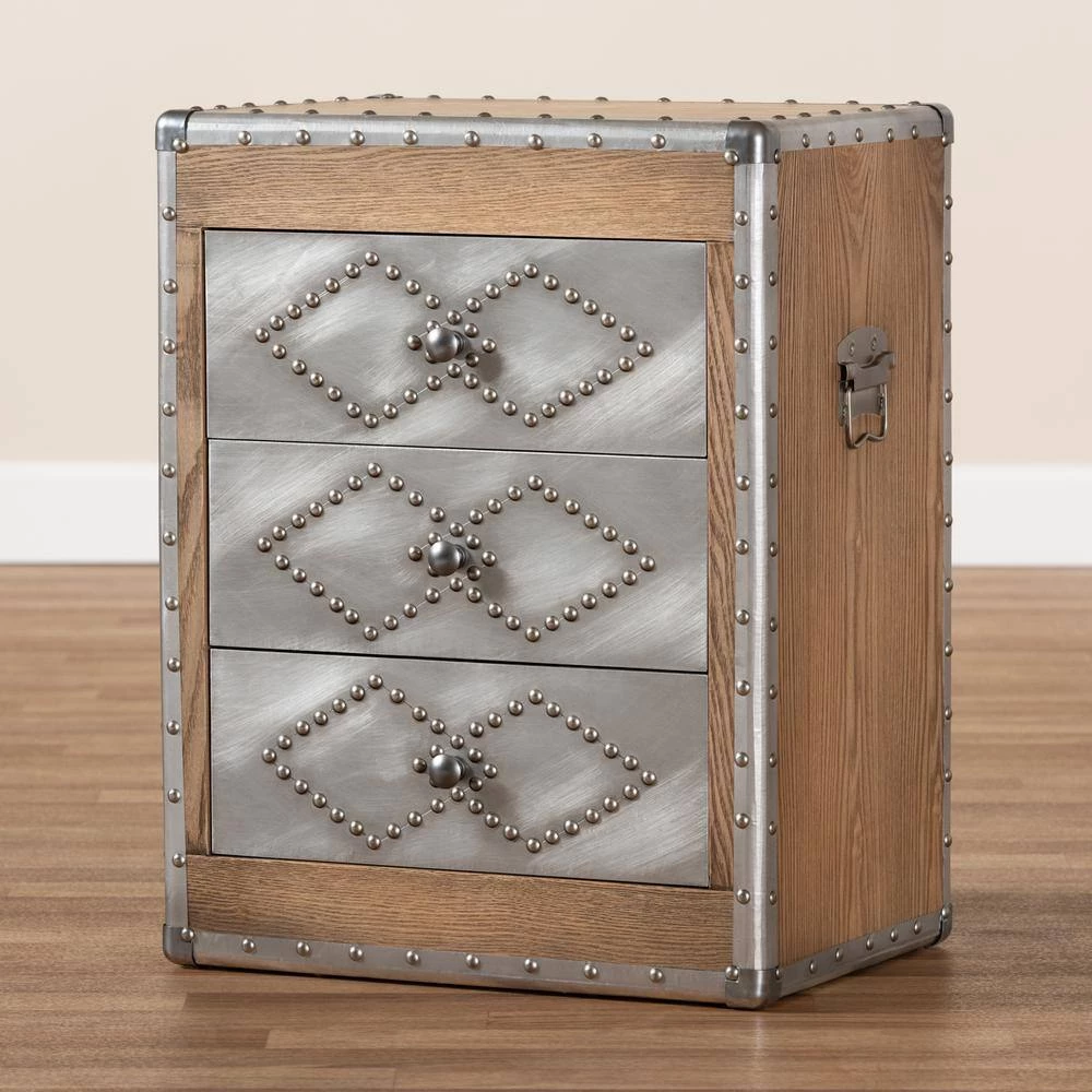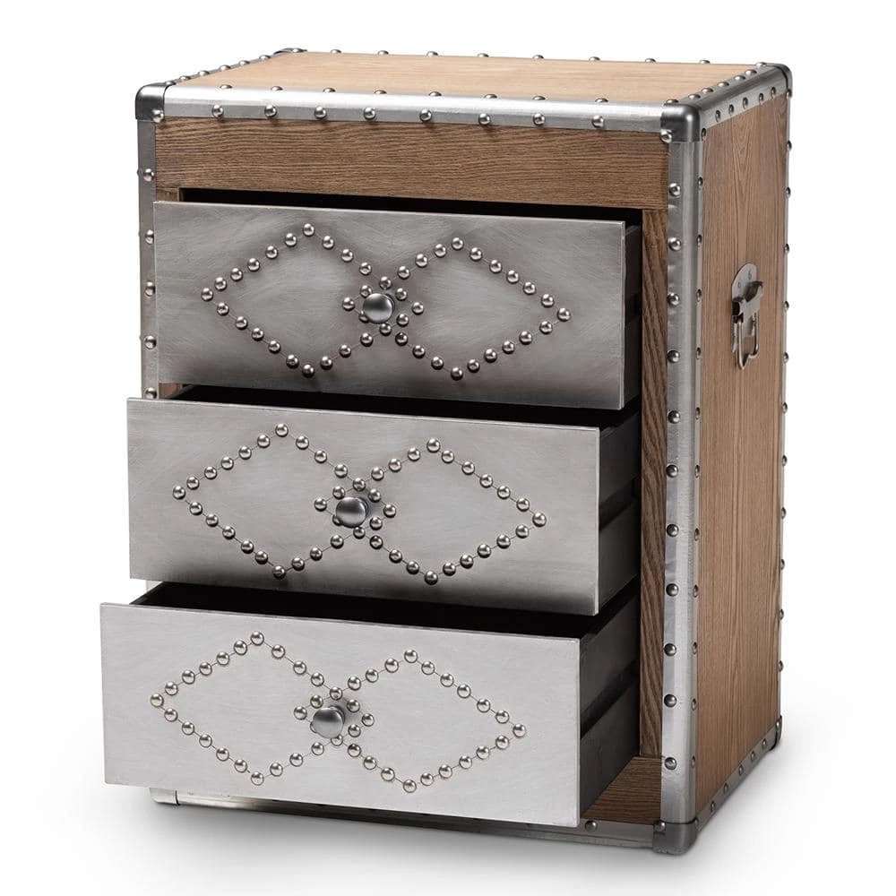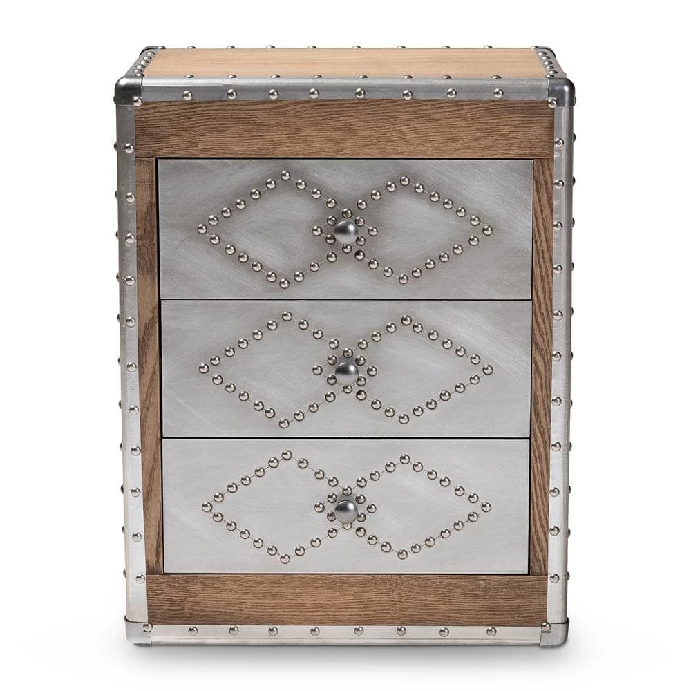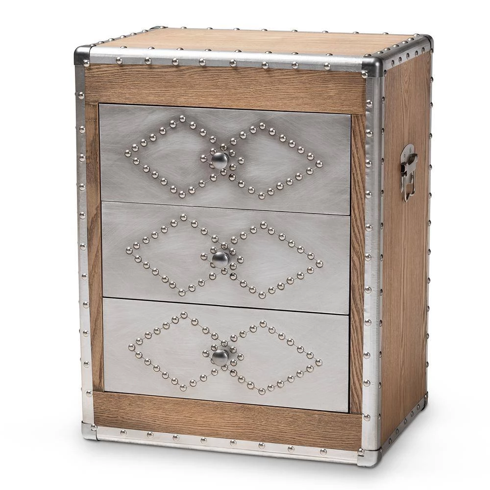 A rich mix of textures makes the Audric cabinet a striking addition to any space. Constructed from light brown-finished MDF wood and brushed silver metal, this piece features cool rivet detailing along its metal edges. Three drawers provide storage for miscellaneous items and knick-knacks. Each drawer is embellished with a pair of interlocking diamond forms, giving the piece a decorative touch. Inspired by vintage storage trunks, the Audric features metal handles on either side, as well as corner protectors. Silver Metal drawer pulls complete the look. Use this stylish piece as an end table in the living or as an accent piece in the entryway. The Audric cabinet is made in China and will arrive fully assembled.