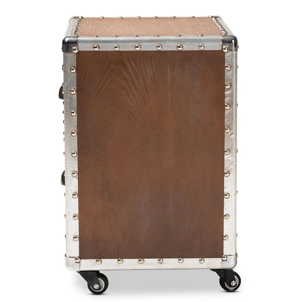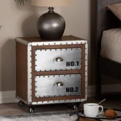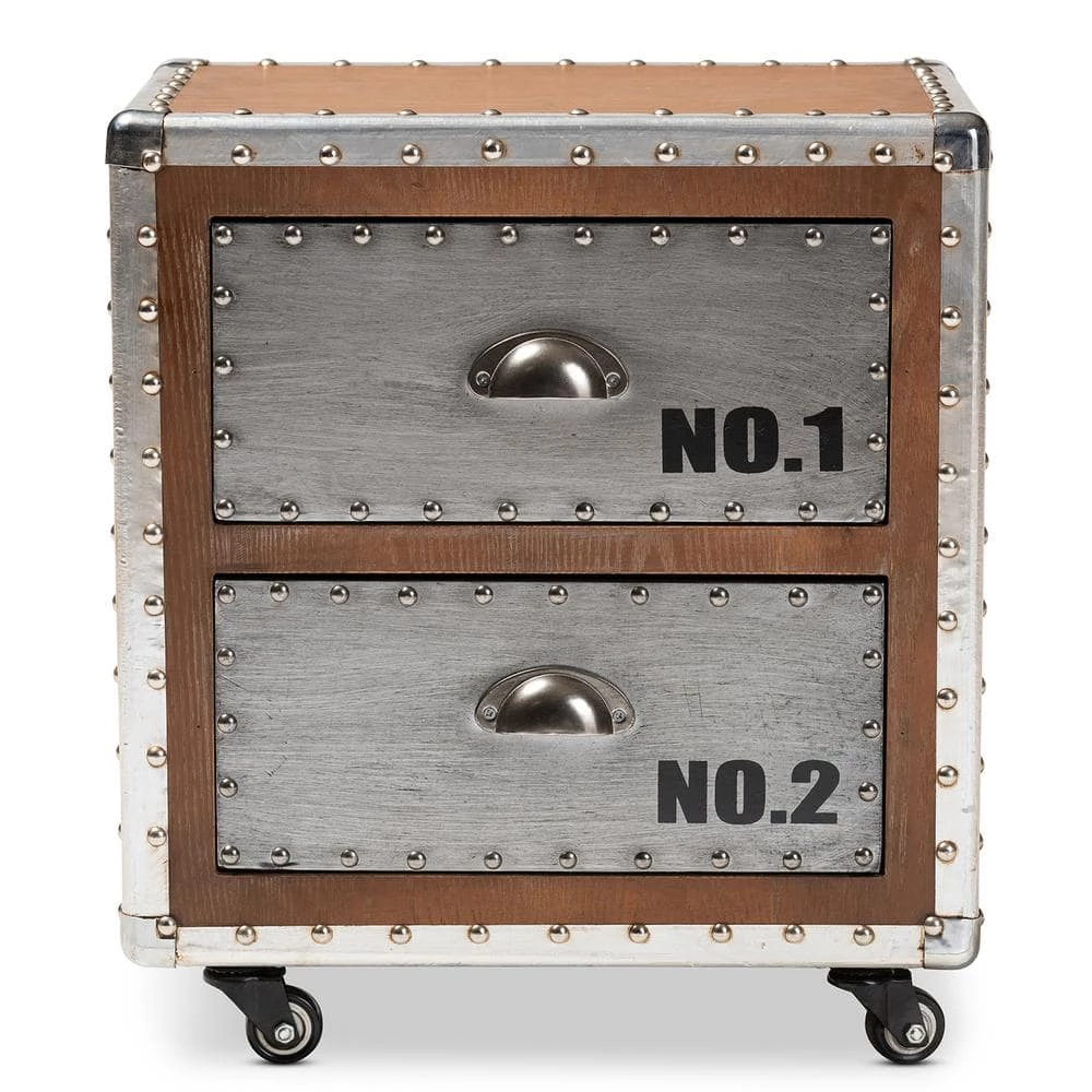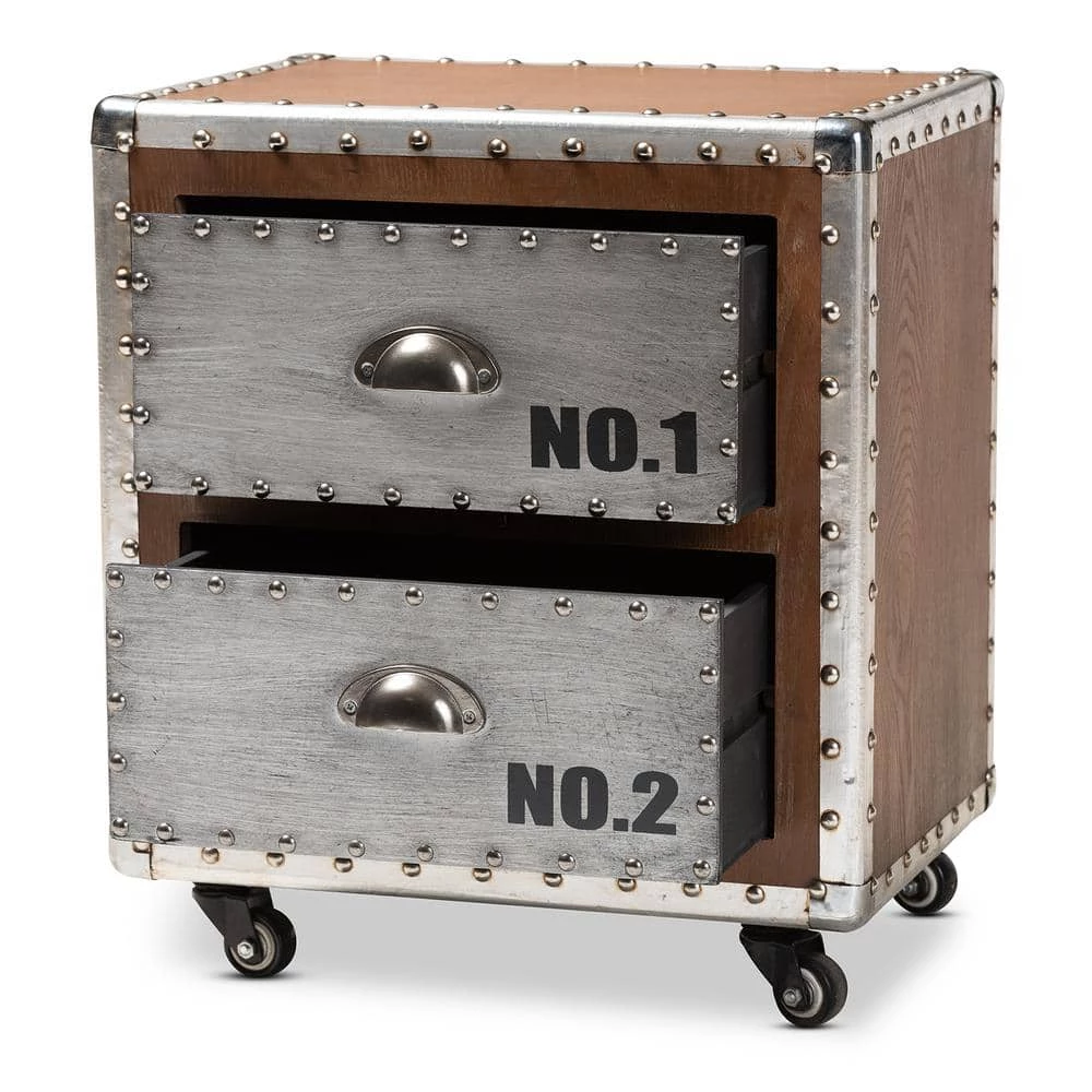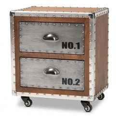 Featuring a rich mixture of materials, the Avere nightstand is an eye-catching addition to any space. Constructed from light brown-finished MDF wood and distressed metal for an aged look, this industrial-inspired piece features cool rivet detailing along its metal edges. Two spacious drawers provide room to keep items organized and out of sight. Each drawer is embellished with a black number, adding to its industrial charm. The Avere is fitted with four wheel casters for smooth mobility so you can easily move this piece around as you reconfigure your space. The Avere nightstand is made in China and will arrive fully assembled.