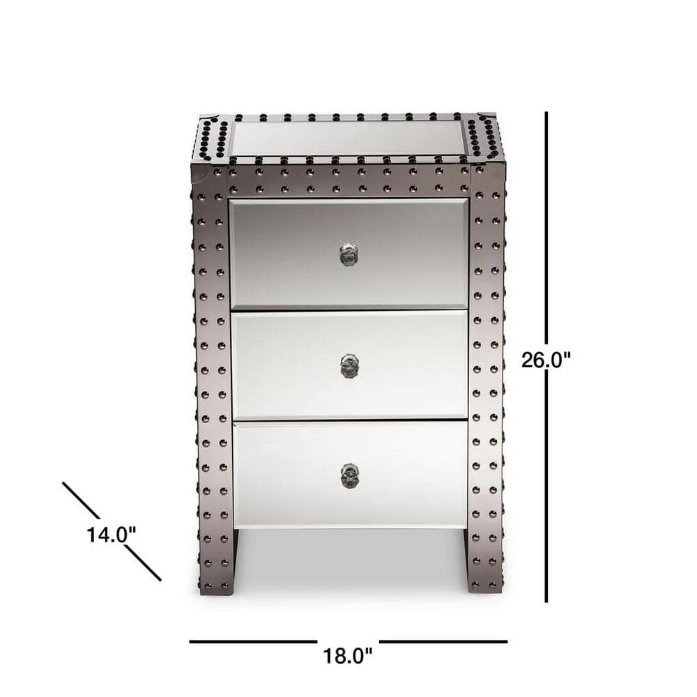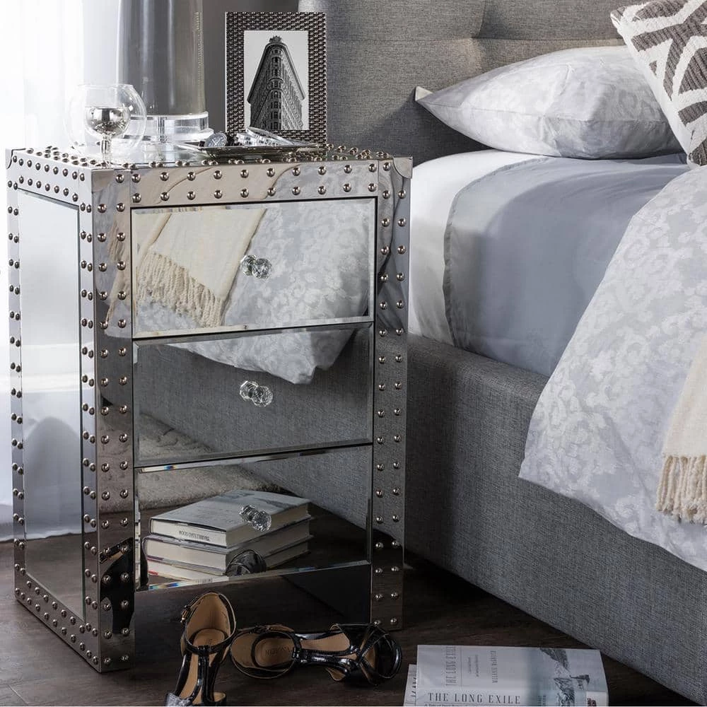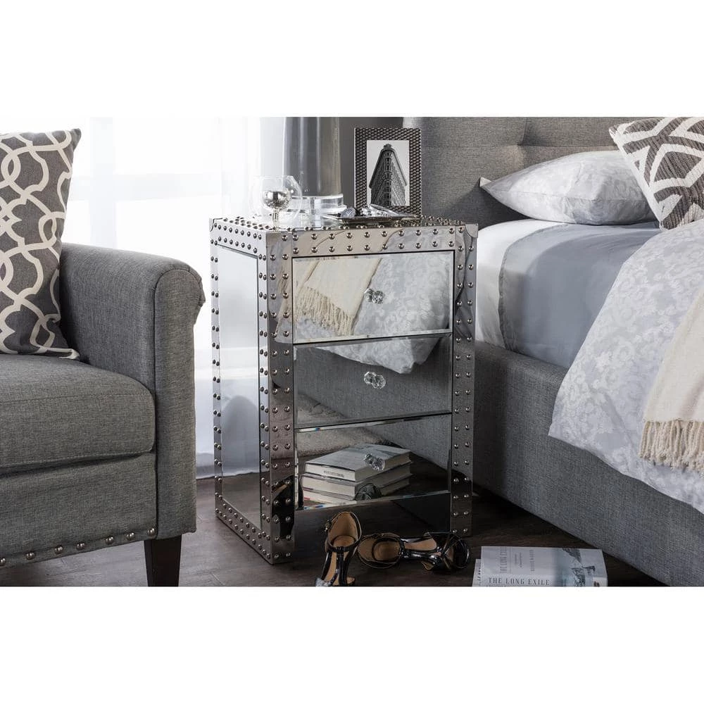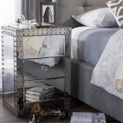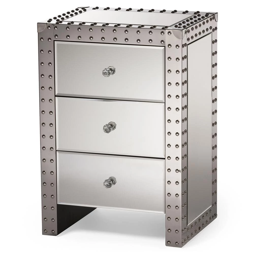 The nightstand is an essential piece for any bedroom, it’s where you can keep your night time reading, it’s a resting place for your glasses and the throne on which your merciless alarm clock can rule. It’s also an important balance piece that can accentuate your bed’s features and highlight your whole bedroom’s design. The Azura mirrored contemporary night stand offers a sleek, upscale look for any modern bedroom space. Stylishly embellished with mirrored glass finish and nail heads trim on all sides, the Azura offers the perfect touch of elegance and will be a stunning piece to add to your bedroom collection. Three spacious drawers line the front with each one fitted with lovely crystal knobs. These provide an understated look while making the drawers accessible. The mirrored finish surfaces and the silver nail heads trim will catch the light beautifully and create a glamorous, sparkling look in your bedroom. Made in China, the Azura nightstand will arrive fully assembled.