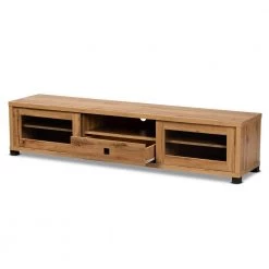 Meet the demands of your living room with the superb utility and sophisticated style of the Beasley TV stand. Made in Malaysia, this TV stand is crafted from oak brown finished wood that adds a natural touch to any interior space. The open shelf offers a convenient display for media devices, while 1-drawer and 4-additional shelves behind the doors provide secure storage options. Requiring assembly, the Beasley features a cord management hole on its back panel for quick and easy setup. Sliding glass doors allow for decorative customization, making the Beasley TV stand a versatile upgrade to any living room.