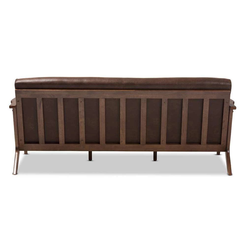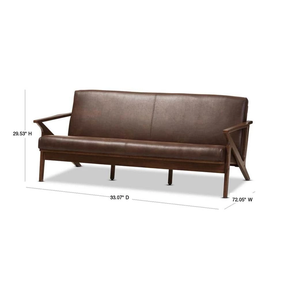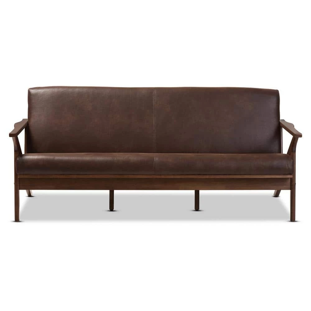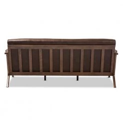 Welcome plush comfort into your home with the vintage style Bianca 3-seater sofa. Constructed of durable rubberwood for exceptional durability and stable comfort, the Bianca is upholstered in a distressed brown faux leather effect fabric to give it a vintage feel. Perfect for a modern or minimal interior, the Bianca features smooth angular solid wood frame in dark walnut finishing for a nod to mid-century modern design that exudes warmth. This retro modern sofa is built with clean paneled lines on the seat back, bringing relaxing vibes into your living room and complementing your home with lavish style. For a coordinated look, pair the sofa with other pieces in the Bianca range, a stunning lounge set perfect for modern lounges and receptions. Made in Malaysia, the Bianca requires assembly.