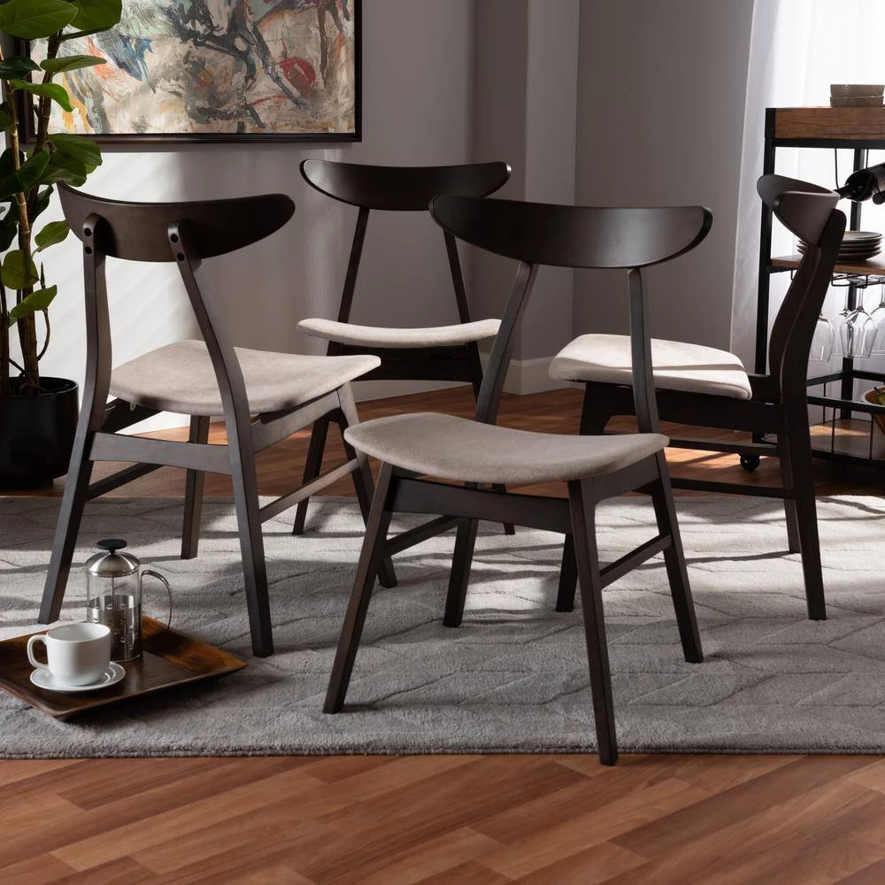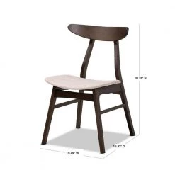 A simple, streamlined design makes the Britte dining chair an easy addition to any dining space. Constructed from durable rubberwood, the Britte is upholstered in a soft neutral fabric that complements the dark oak brown finish on the wood. Its curved seat and backrest provide ample dining comfort. Inspired by mid-century design, the Brittes splayed legs create a cool, retro profile. Pair the Britte chair with the Britte dining table to complete the look. The Britte dining chair is made in Malaysia and requires assembly.