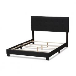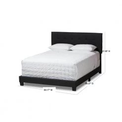 Stay and sleep in comfort with this Brookfield modern and contemporary dark charcoal grey fabric upholstered grid-tufting full size bed. Crafted with style and characters, the bed features stylish grid-tufting design which can accommodate a queen sized mattress. Fitted with solid wood legs in black, the Brookfield provides stability and a stylish headrest. The entire headrest has been upholstered in high quality dark charcoal grey polyester fabric while grid-tufting design gives the piece a touch of sophistication. You’ll love having this inside your bedroom. It offers comfort with a touch of delicate retro feel. Made in Malaysia, the Brookfield requires assembly.