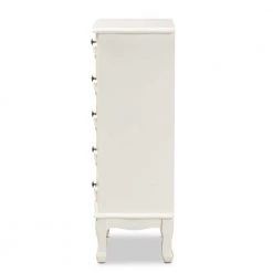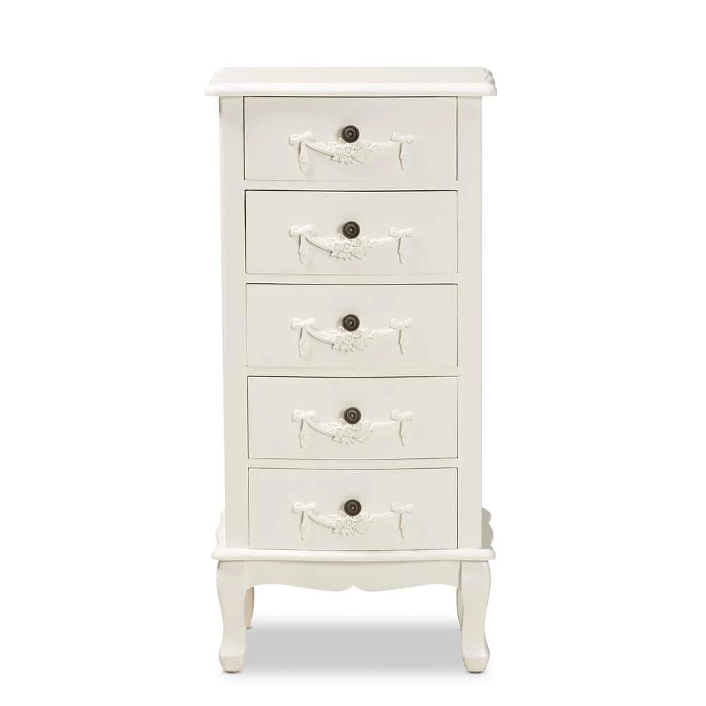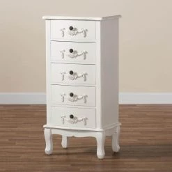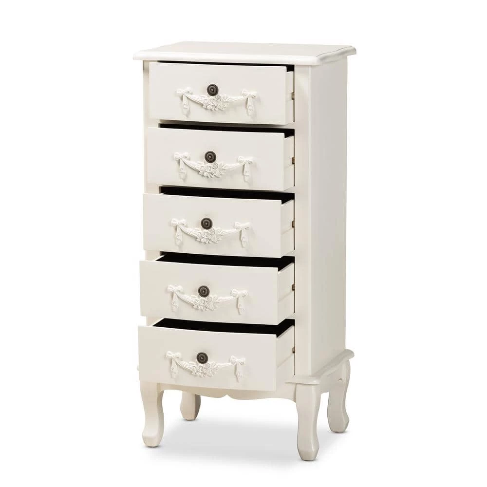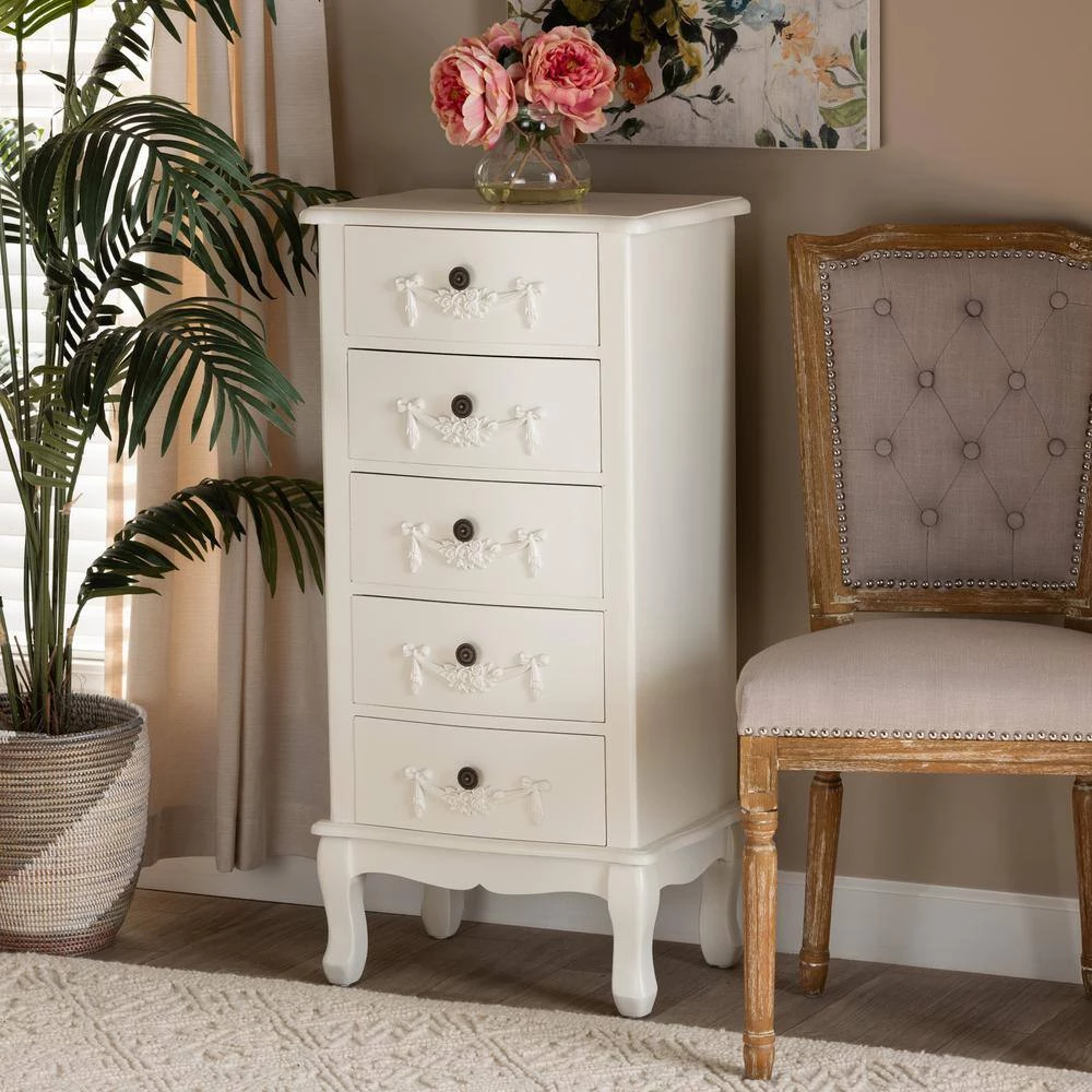 Bring graceful organization to your home with the fantastic design of the Callen storage chest. Made in China, this chest is constructed from sturdy wood. Five drawers bring order to your daily routine with plenty of storage space to organize and declutter busy rooms. The Callen is adorned with floral moldings for an elegant display that is sure to stand out. Metal drawer knobs add a minimalist touch, making the Callen storage chest a resourceful yet stylish addition to any space.