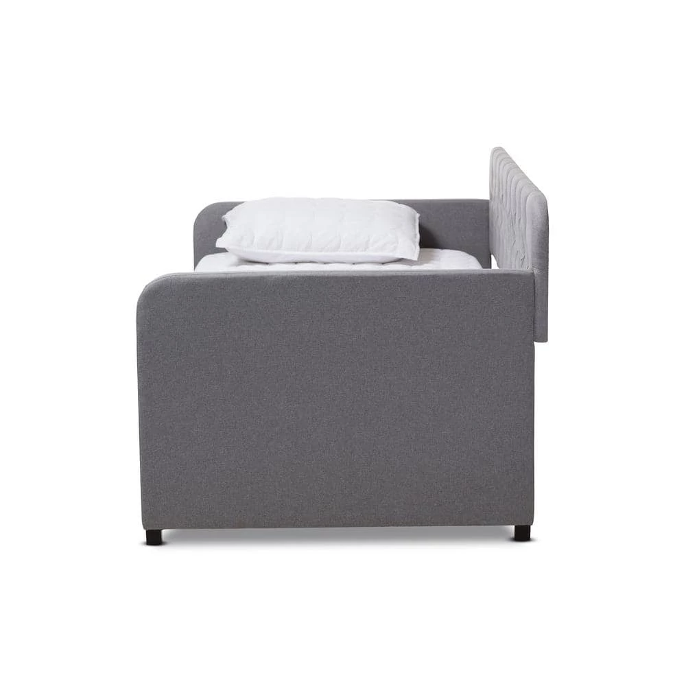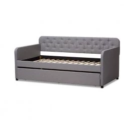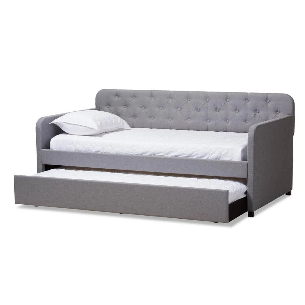 Featuring a roll-out trundle bed, the Camelia sofa daybed is ideal for rooms with space constraints. Constructed from solid rubberwood and MDF wood, the Camelia is foam-padded and upholstered in an elegant neutral fabric for the highest level of comfort. The daybed is fitted with a pull-out twin size trundle, providing convenient accommodation for guests. Inspired by both modern and classic elements, the daybed showcases a streamlined silhouette and button-tufting on the back panel. This dynamic-piece for furniture will allow you to maximize your space without sacrificing style. The Camelia sofa daybed is made in Malaysia and requires assembly.