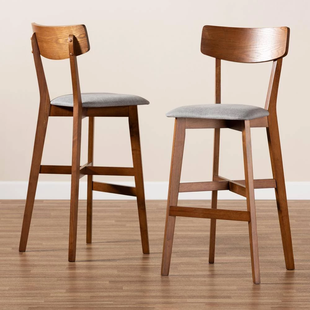 Establish a charming, modern aesthetic in your dining space with the eye-catching Cameron bar stool. Made in Malaysia, the Cameron showcases a warm walnut brown finish that complements a wide variety of color schemes and styles. The seat is padded with a layer of soft foam and upholstered in smooth grey fabric for superb comfort. Requiring assembly, the Cameron features a curved backrest, as well as a footrest for added comfort. A fantastic accent for any home bar or lounge, the Cameron bar stool adds stylish comfort to any space.