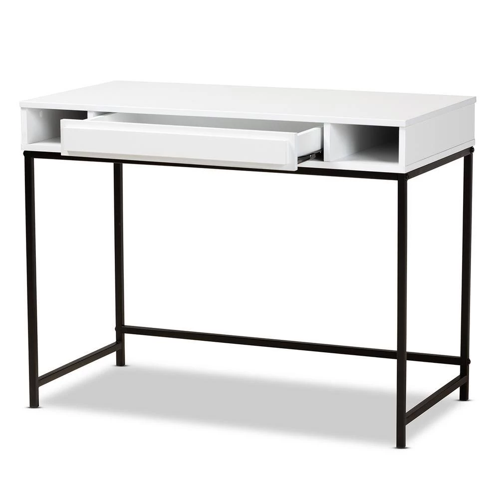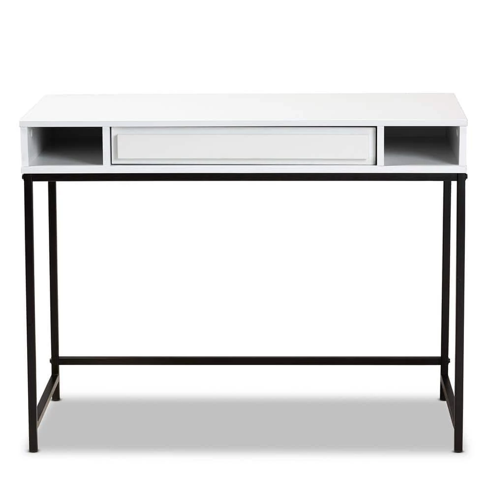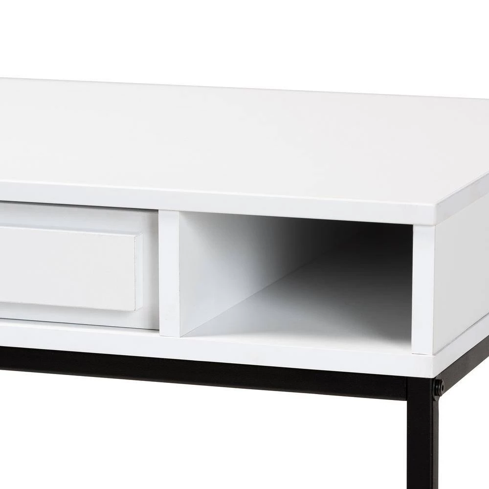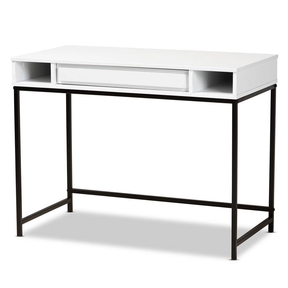 Modernize your workspace with the contemporary style and convenience of the Cargan desk. Made in Malaysia, the Cargan is comprised of a slim metal frame equipped with a large, rectangular white finished wood tabletop. Two storage compartments and one large drawer easily keep supplies and equipment nearby. Requiring assembly, thin, black legs allow for a more open feel while also providing extra storage space underneath the piece. Clean, modern design coupled with extraordinary versatility distinguishes the Cargan desk as an exceptional upgrade to any private or public office space.