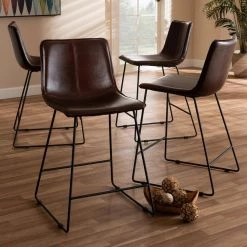 A smooth silhouette is part of what makes the Carvell pub stool set so inviting. The rustic and industrial-inspired design comes through in the matte black metal legs and simple lines. The Carvell’s seat is upholstered in brown faux leather, with foam padding and a slightly reclined chair back for comfort. The pub stool set features a stitched grid design for effortless style and sled base legs. The Carvell can be easily coordinated with the existing decor in your dining room, kitchen, or breakfast nook to complete your space’s handsome, industrial look. Made in China, the pub stool set requires assembly.