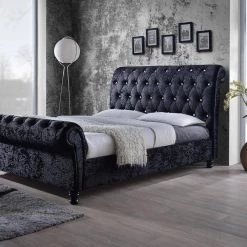 The perfect statement piece, the Castello combines stylish buttoned detailing with a striking rolled headboard and footboard design. Upholstered in black velvet with complementary dark rubberwood feet and accented with glamorous faux crystal buttons, the Castello will stand out in your bedroom. This bed frame has a sprung slatted base to give natural bounce, adjusting to where pressure is most exerted for greater comfort. Made in Malaysia, the bed requires assembly. To clean, wipe with dry cloth.