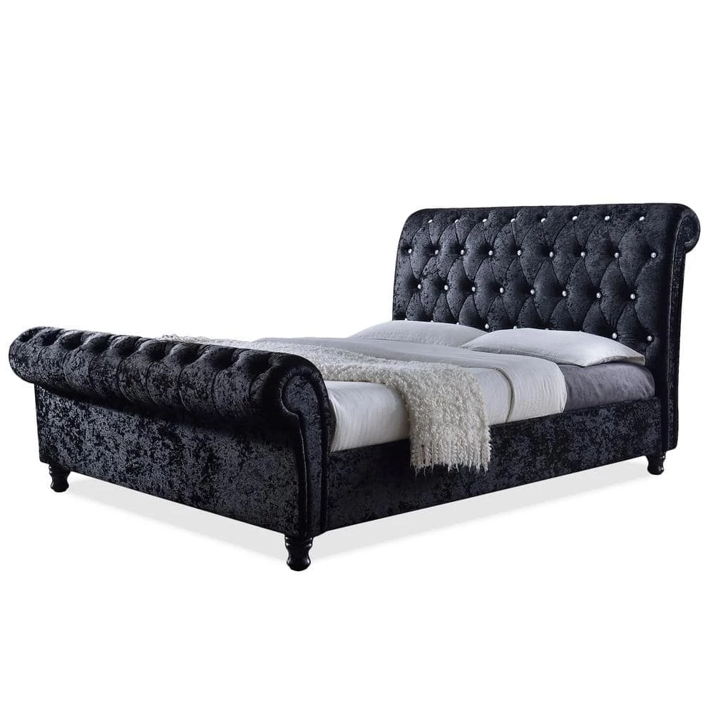 The perfect statement piece, the Castello combines stylish buttoned detailing with a striking rolled headboard and footboard design. Upholstered in black velvet with complementary dark rubberwood feet and accented with glamorous faux crystal buttons, the Castello will stand out in your bedroom. This bed frame has a sprung slatted base to give natural bounce, adjusting to where pressure is most exerted for greater comfort. Made in Malaysia, the bed requires assembly. To clean, wipe with dry cloth.