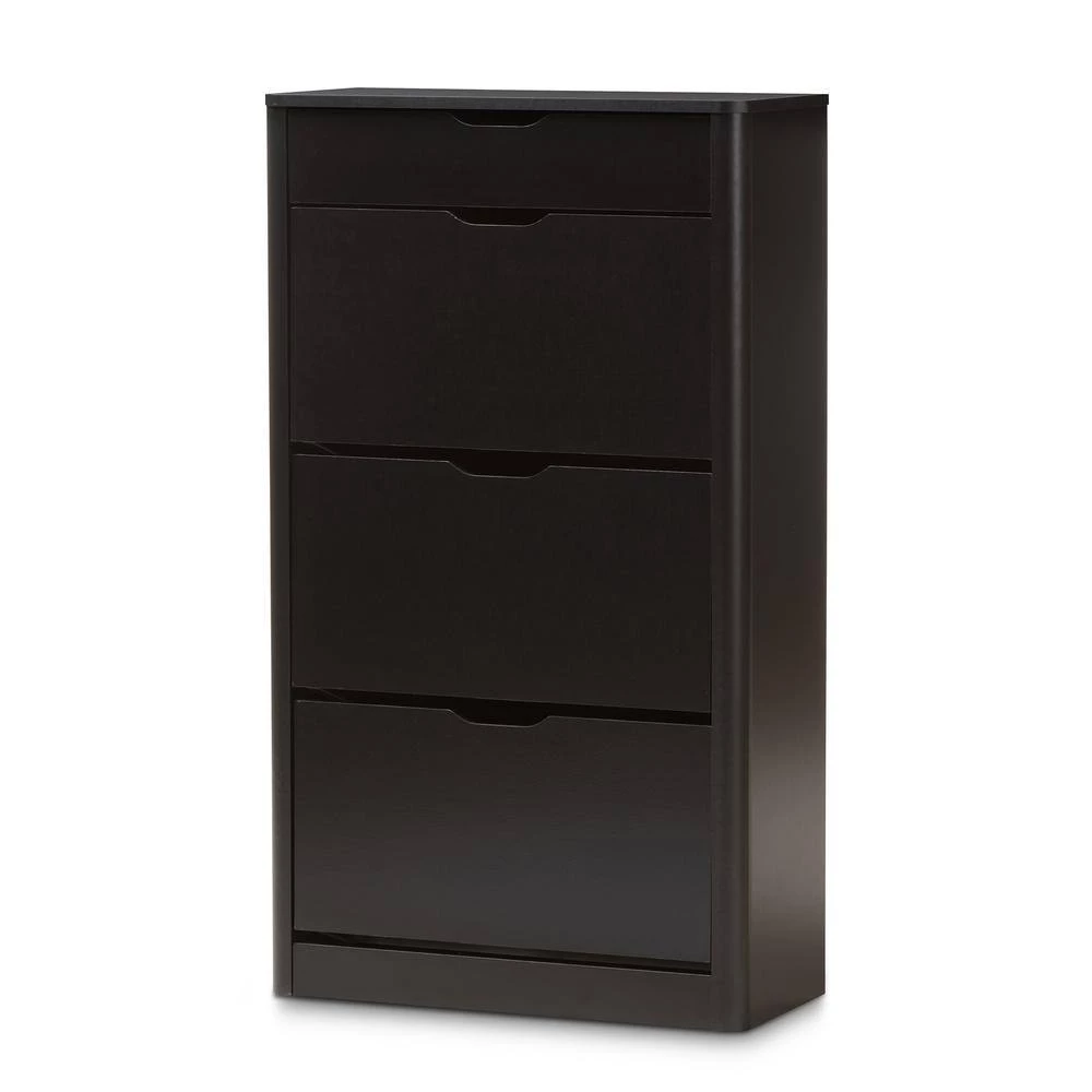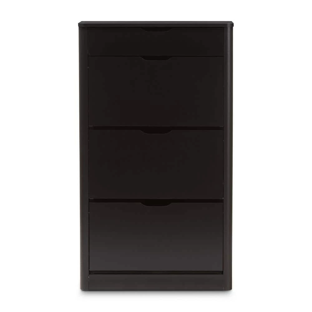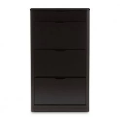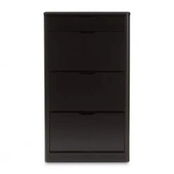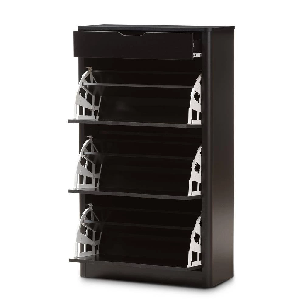 Update your everyday organization with the smart design and spacious drawers of the Cayla black shoe cabinet. Constructed of durable engineered wood for a sturdy structure with black finish for lasting good looks, the Cayla features soft-forming side panels outlook for a contemporary feel. One drawer space at the top is ideal for storing spare knick-knacks, deodorizers and shoe-shine polishes. Three drawers with fold-down doors reveal angled compartments to easily access your shoes. Store up to 12 pairs of shoes for your convenience. Perfect for your entrance or bedroom for keeping sneakers, heels and flats under wraps. Made in Malaysia, the Cayla requires assembly.
