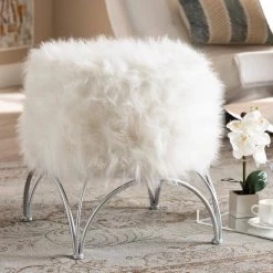 Add a chic, cozy accent to any space with the Celia ottoman. Upholstered in white faux fur, the Celia provides the ultimate in luxurious softness. Its silver geometric base gives the ottoman an ultra-modern look. Use this versatile piece as an extra seat or as a footstool. The Celia ottoman is made in China and will arrive fully assembled.