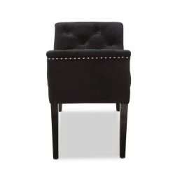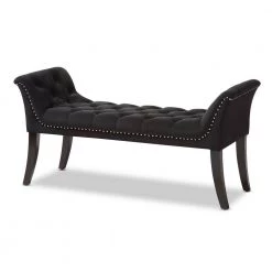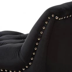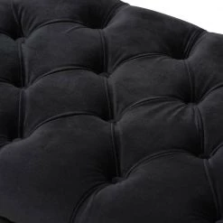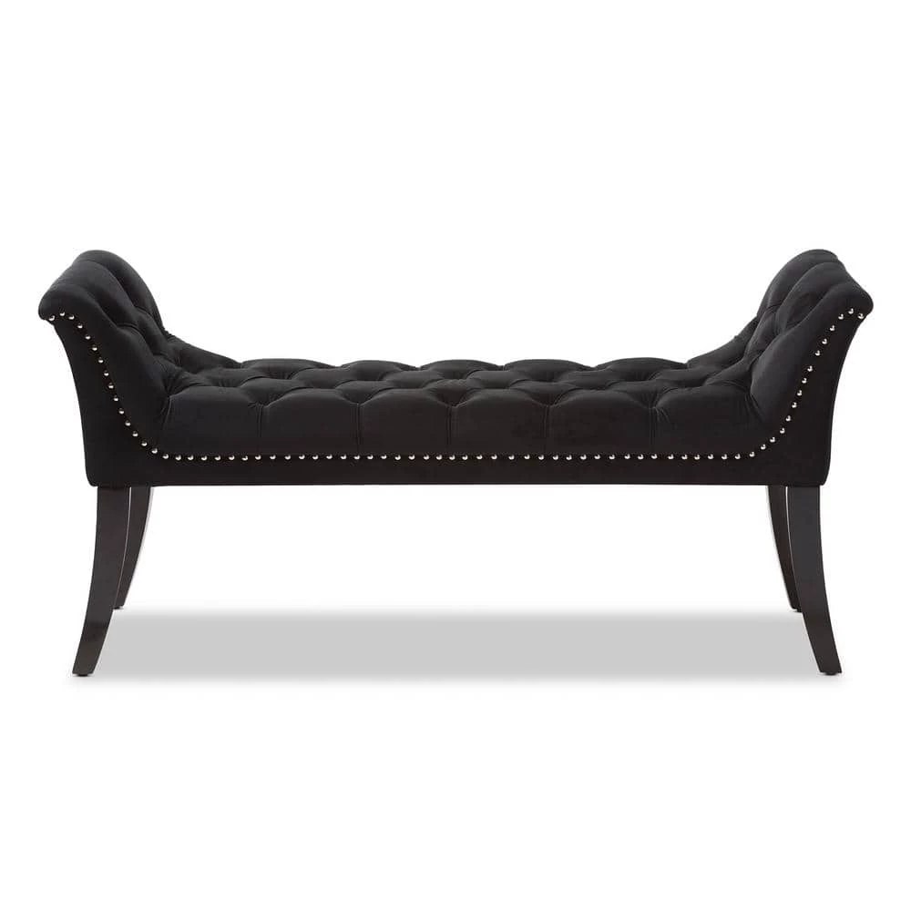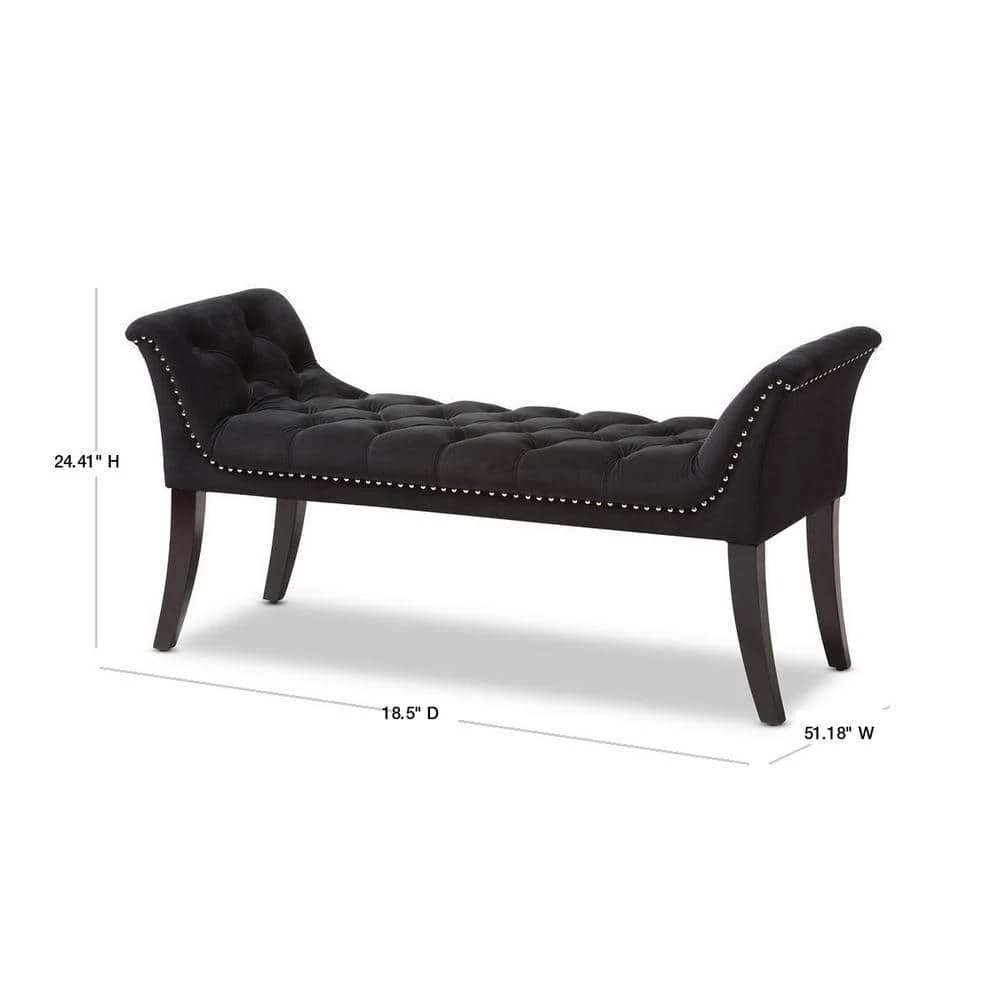 Everything about the Chandelle bench evokes a sense of sophistication and opulence. The luxe and contemporary-inspired design comes through in all of the details in the bench. The Chandelle is foam-padded for comfort, and upholstered in a chic black velvet. The seat of the bench features a diamond tufting design with black buttons. The Chandelle’s sturdy wood legs are finished in black, smartly contrasted with the silver-finished nailhead trim of the bench. The arms of the Chandelle are gently rolled and raised, both to encourage comfort and display its gorgeous design. This sumptuous bench will add a touch of glam to your living room, bedroom, or even in your entryway for extra seating. Made in China, the Chandelle requires assembly.