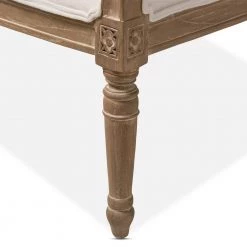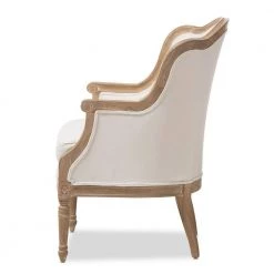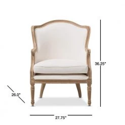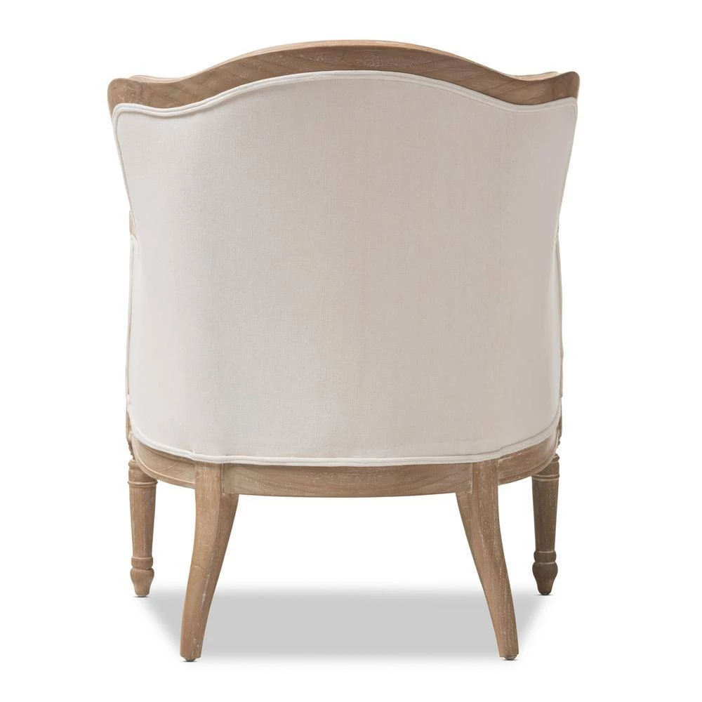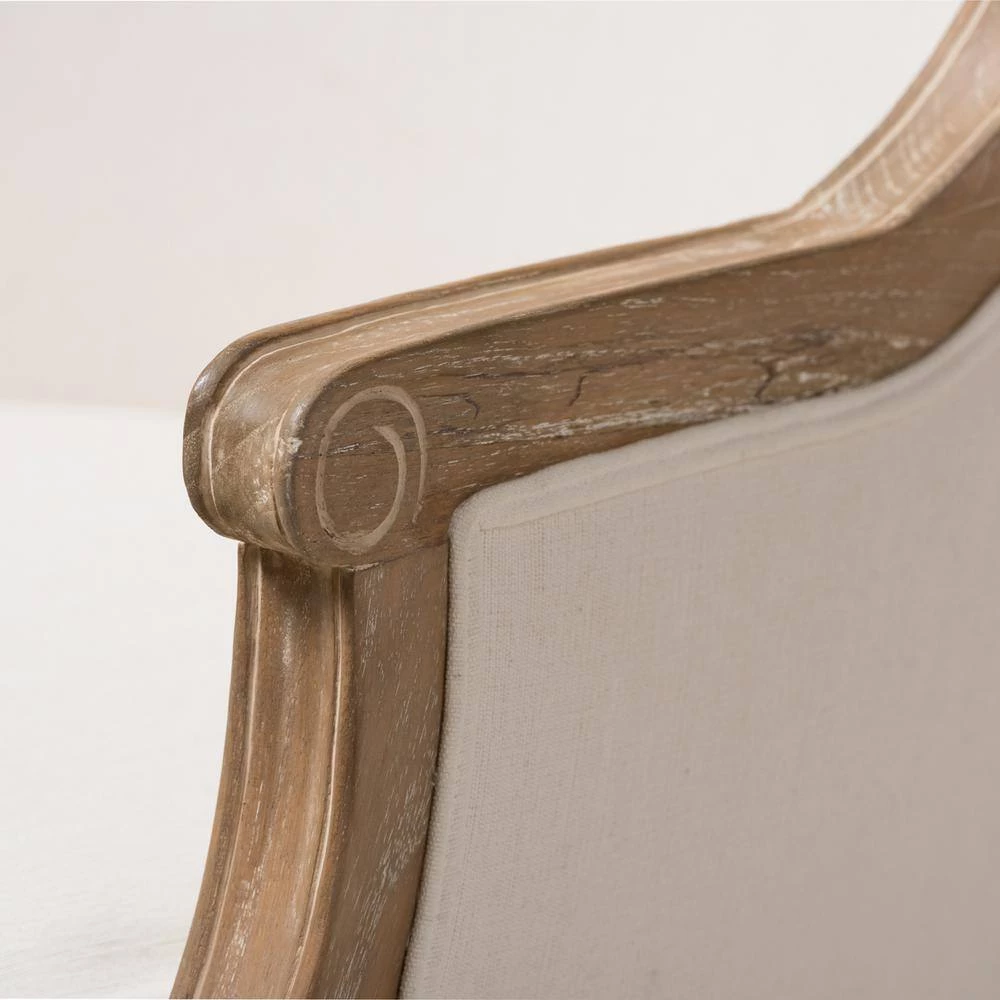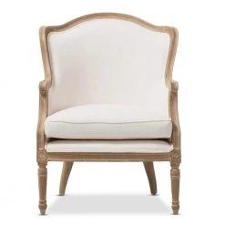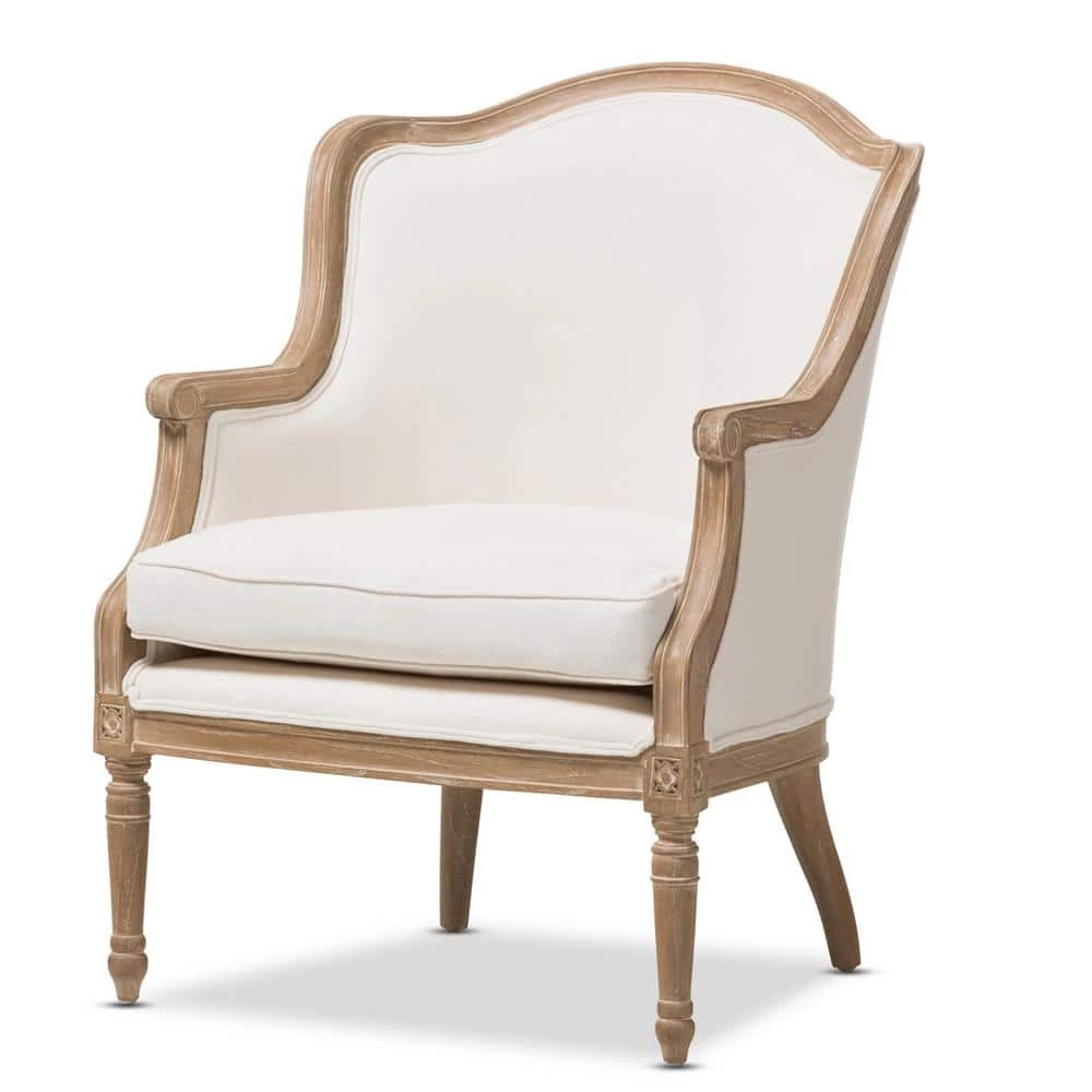 Classic contouring, contrasting leg designs and the comfort of cotton combine to create our Charlemagne Traditional French Accent Chair. Cedar wood frame and distressed brown oak wood finish (with white streaking) celebrate this timeless design. The beige upholstery provides versatility for surrounding the Charlemagne with accents, furniture and wall decor. There is really no comparison to this attention to detail in the discount furniture arena.